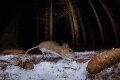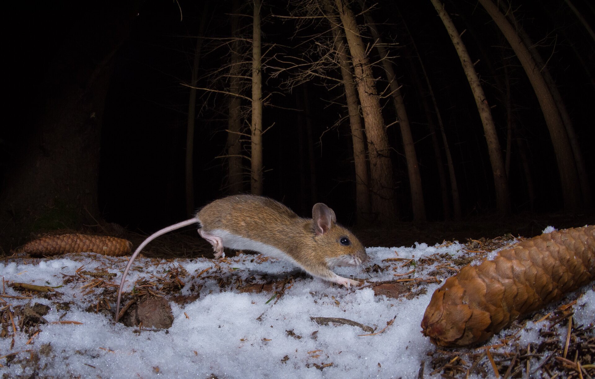 Egy sárganyakú erdeiegér iszkol a hóban, földalatti lakóhelyének bejárónyílásából szökkent ki épp egy sötét fenyves mélyén. Ezek a rendkívül gyors kisemlősök alkonyatban elevenednek meg, és kezdik meg táplálékszerző körútjukat. Imi a Börzsönyben több hétig járt ki erre a helyre, hogy elcsípjen néhány jelenetet ezeknek a félénk és fürge rágcsálóknak az életéből.