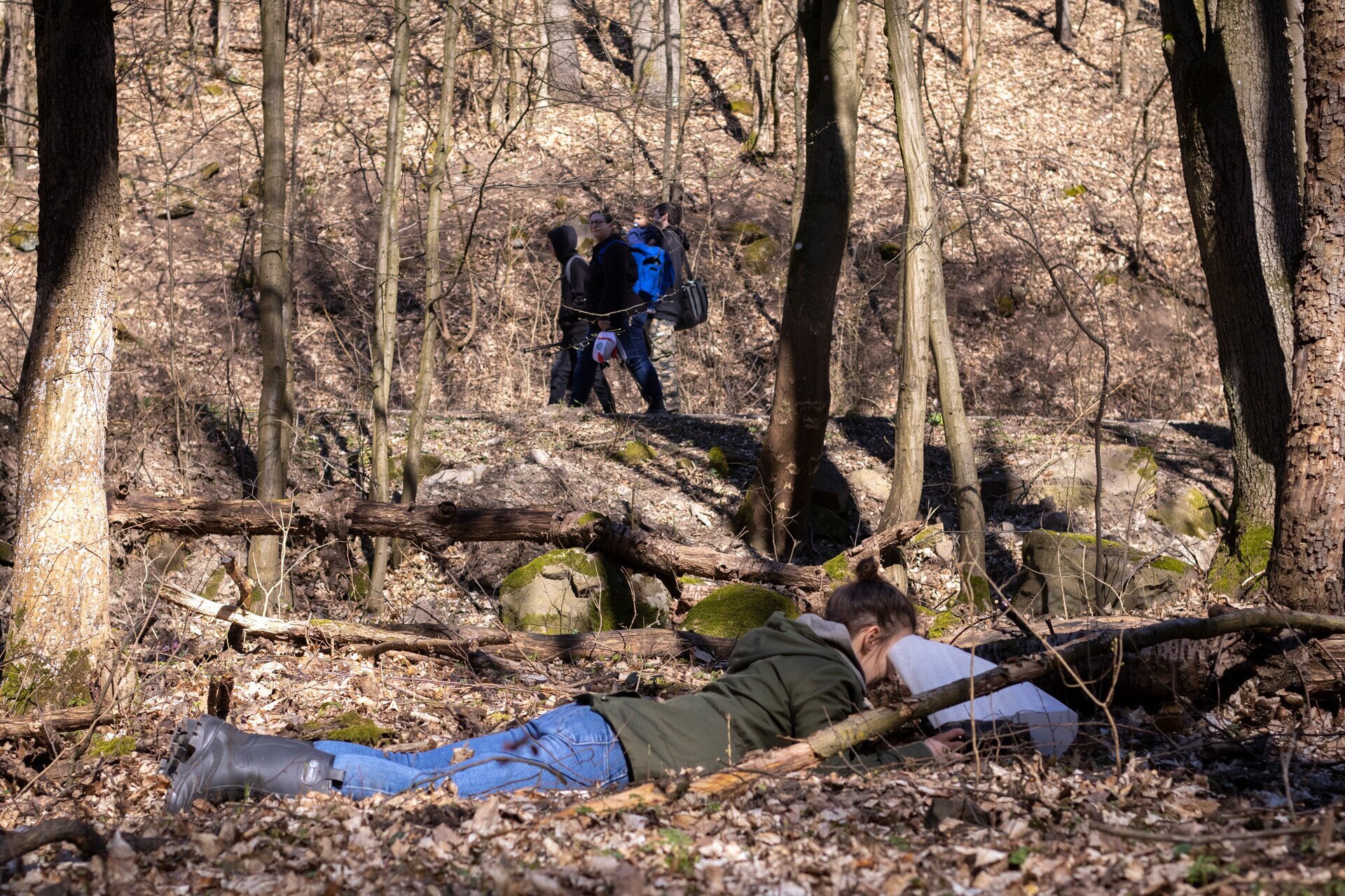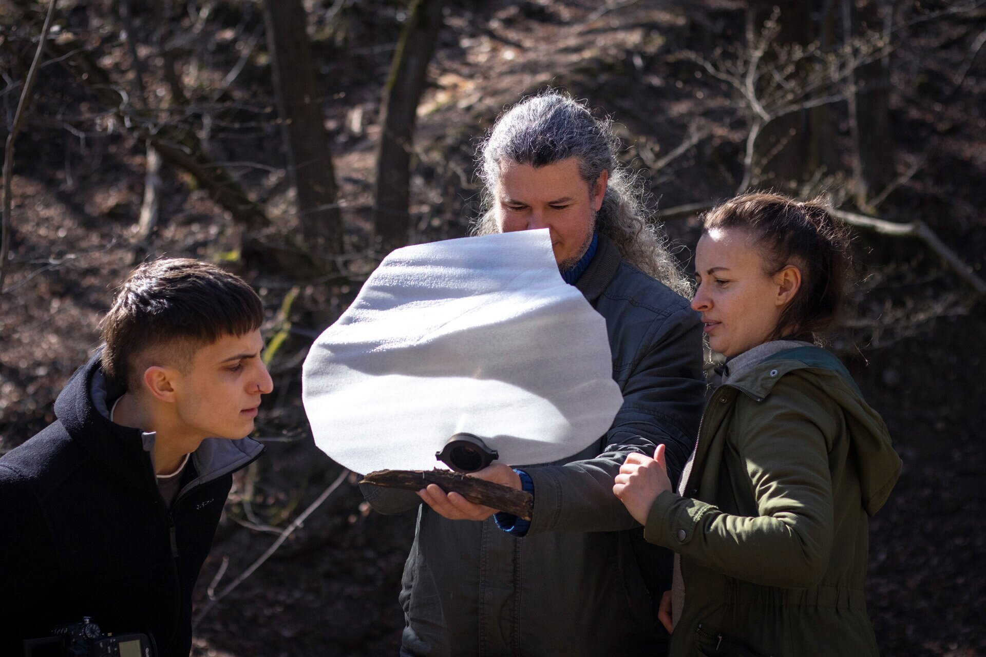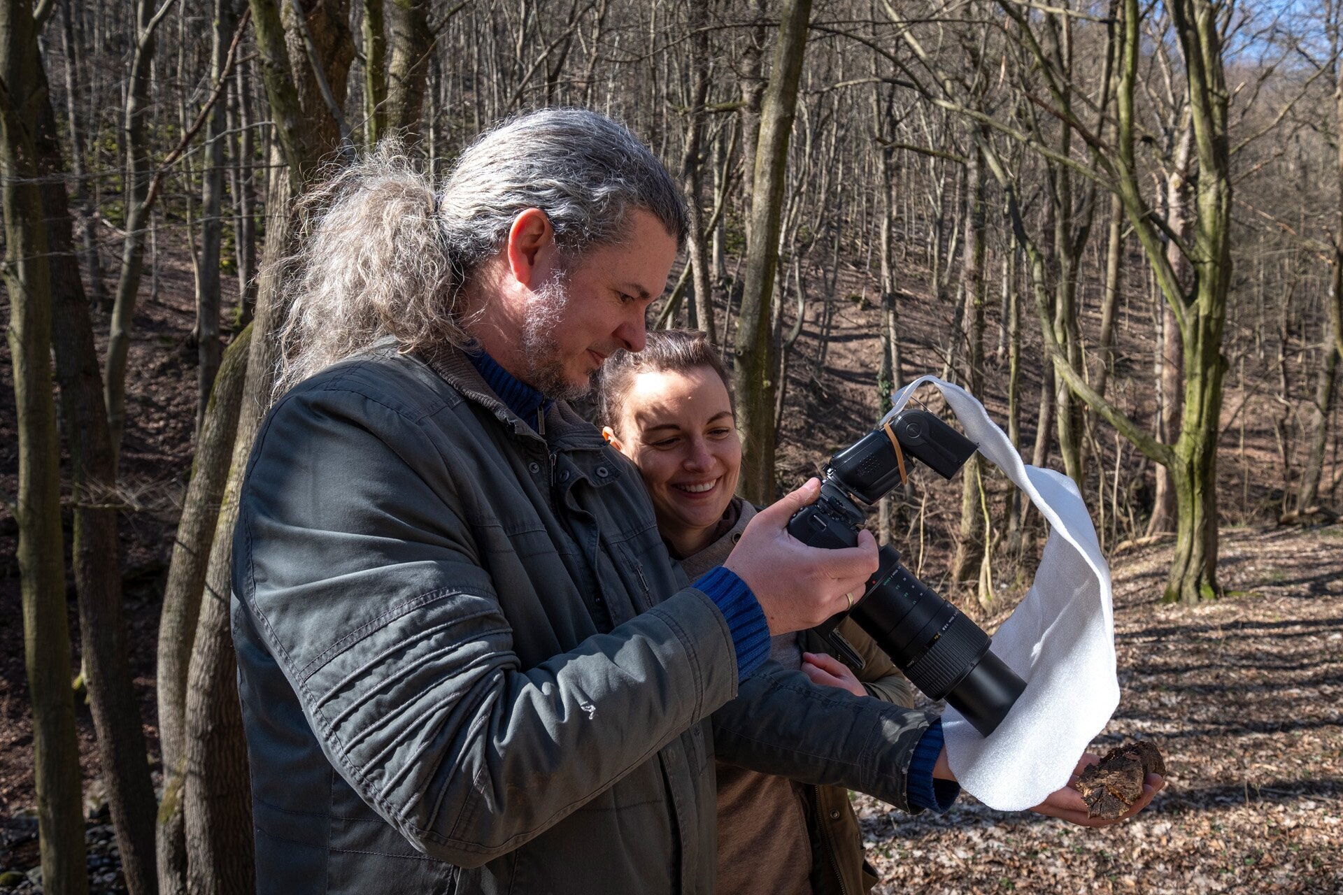 Zsolt kezében könnyűnek tűnt ez a kézből kifotózott módszer, de mivel mi még azzal is küszködtünk először, hogy a témát megtaláljuk, ezért hamar lekerült a földre a fa, és inkább lehasaltunk a fotózáshoz. De azért persze megpróbáltuk