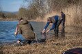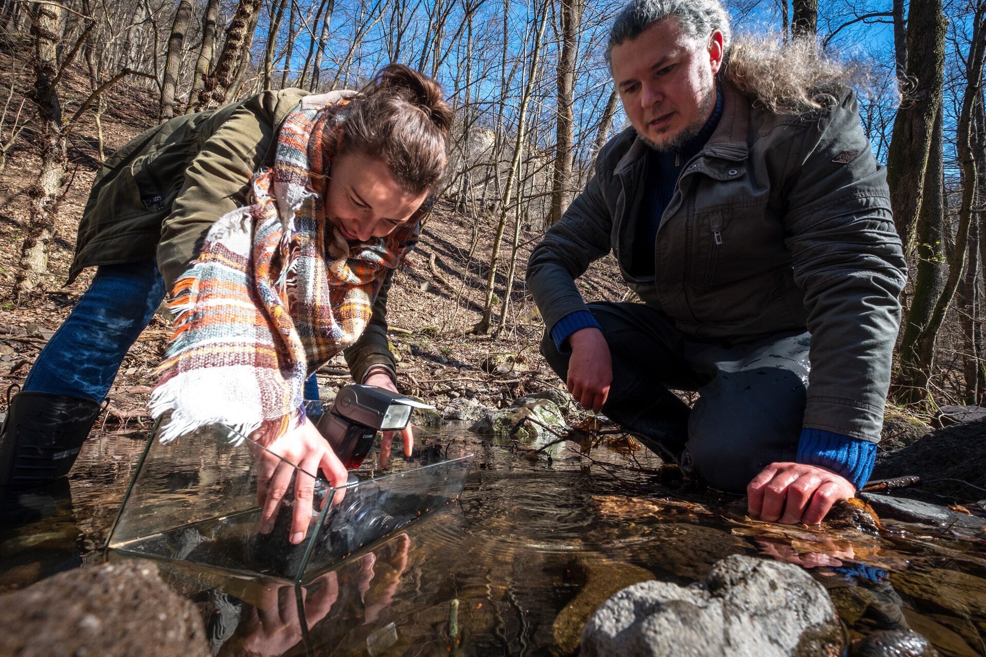 Zsolt és Bálint óvatosan emelgeti a köveket a Bükkös-patakban