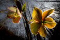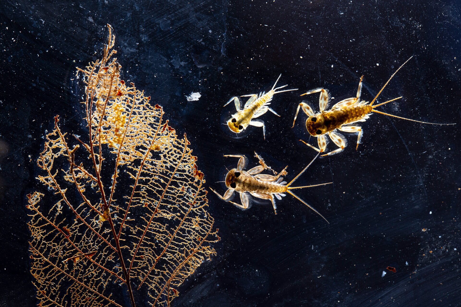 A bolharákok által lerágott levél mellett különböző fejlettségű kérészlárvák láthatók