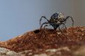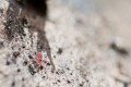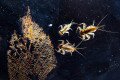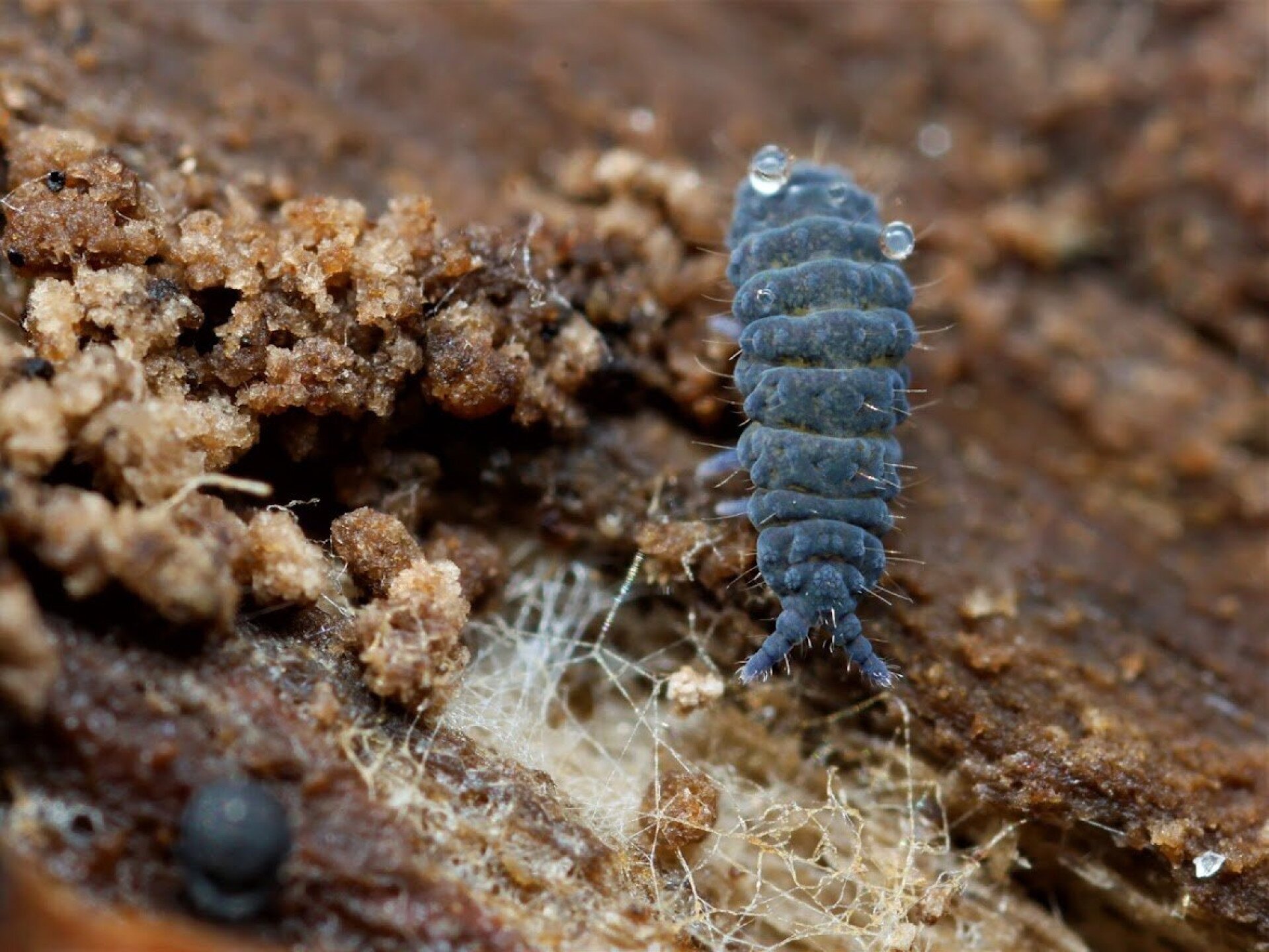 Az ugróvillás mellett az előtérben pici csillogó golyócskák is látszódnak, amelyek páncélosatkák