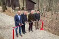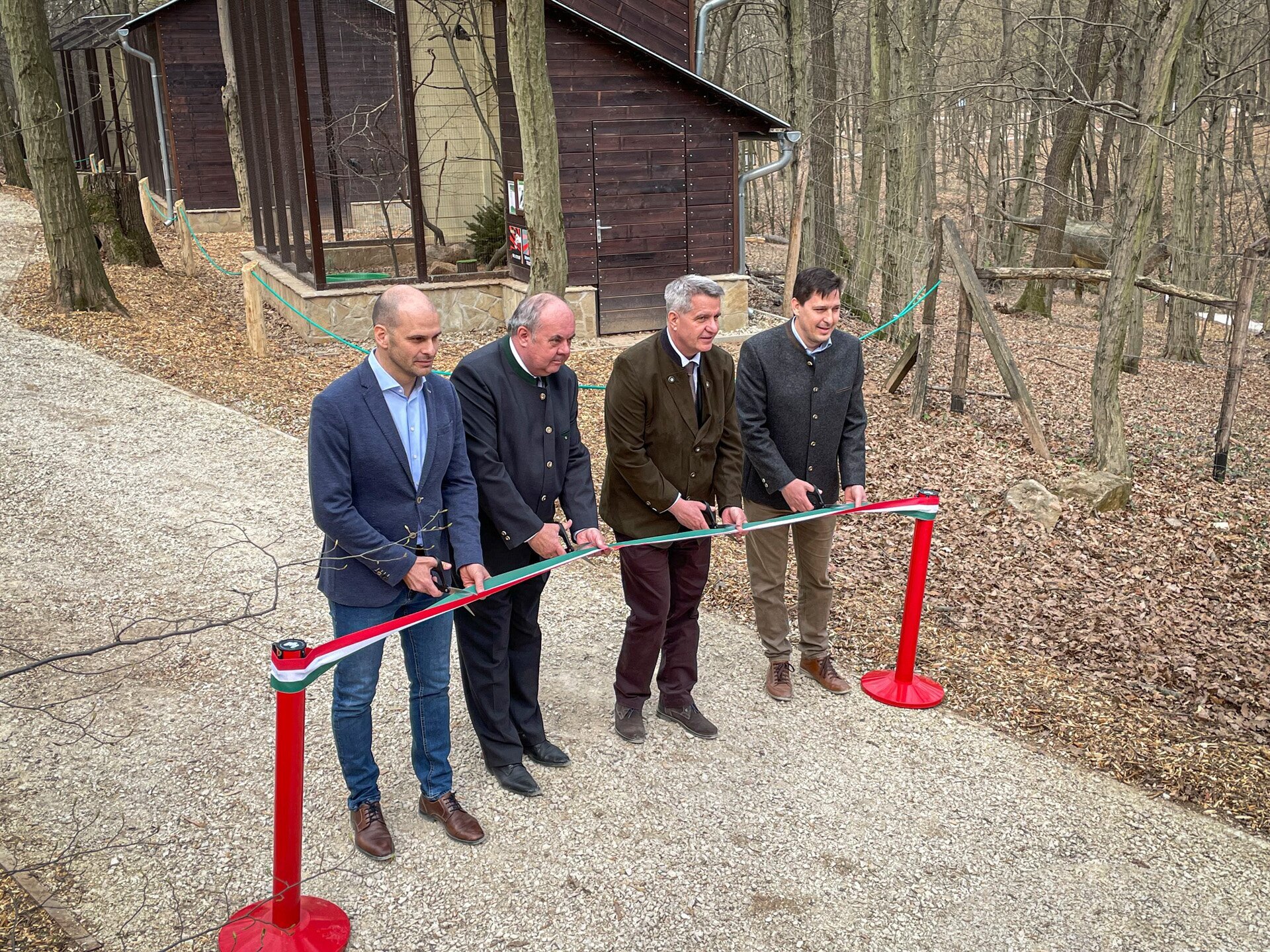 A szalagot vágják balról jobbra: Tassy Márk, a Magyar Természetjáró Szövetség igazgatója, Zambó Péter, az Agrárminisztérium erdőkért felelős államtitkára, Reinitz Gábor, a Pilisi Parkerdő Zrt. vezérigazgatója és Szabó Péter, a Budakeszi Vadaspark igazgatója