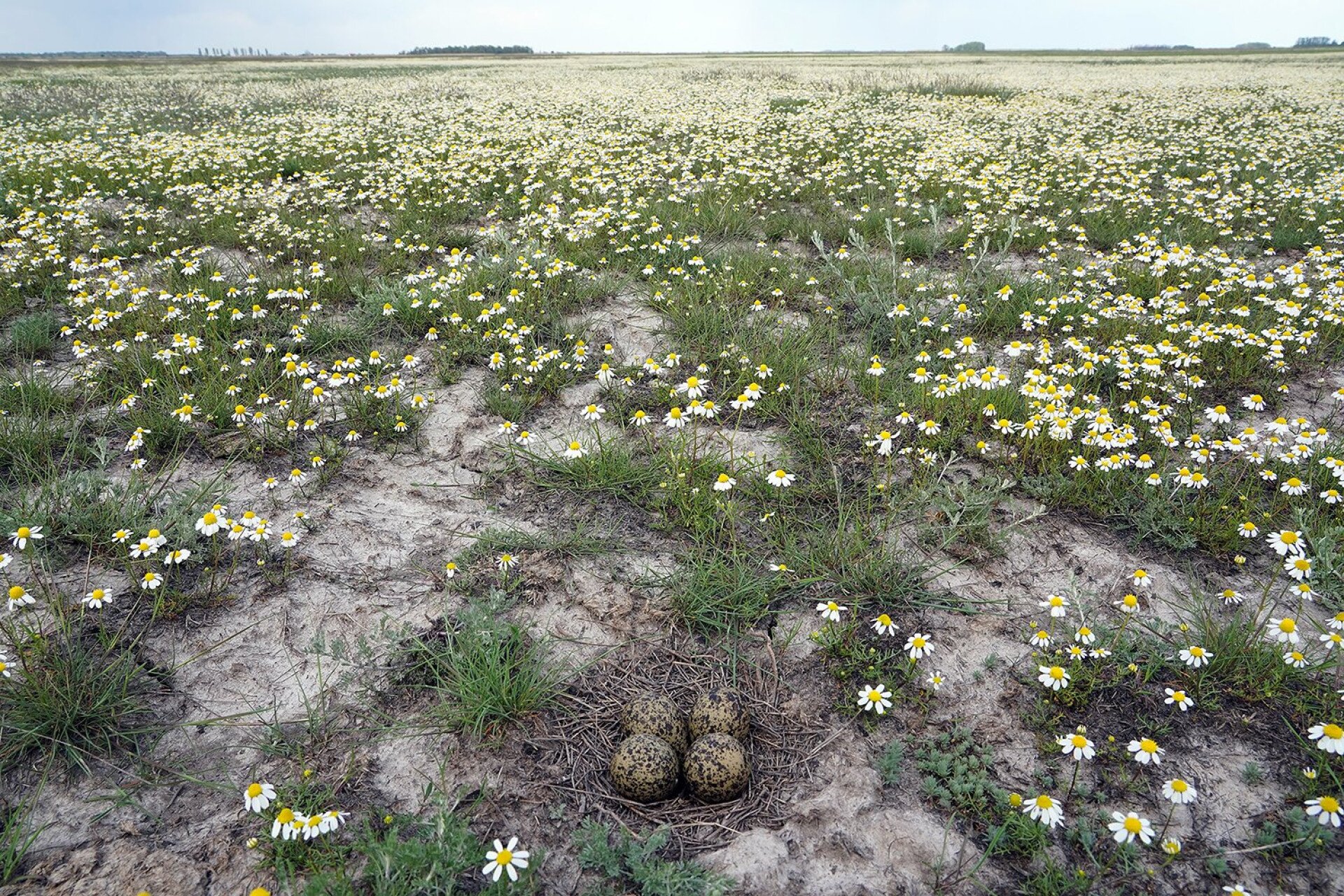 Bíbic fészke a kamillás talajon, a tojások rejtőmintázata miatt szinte alig lehet őket észrevenni