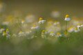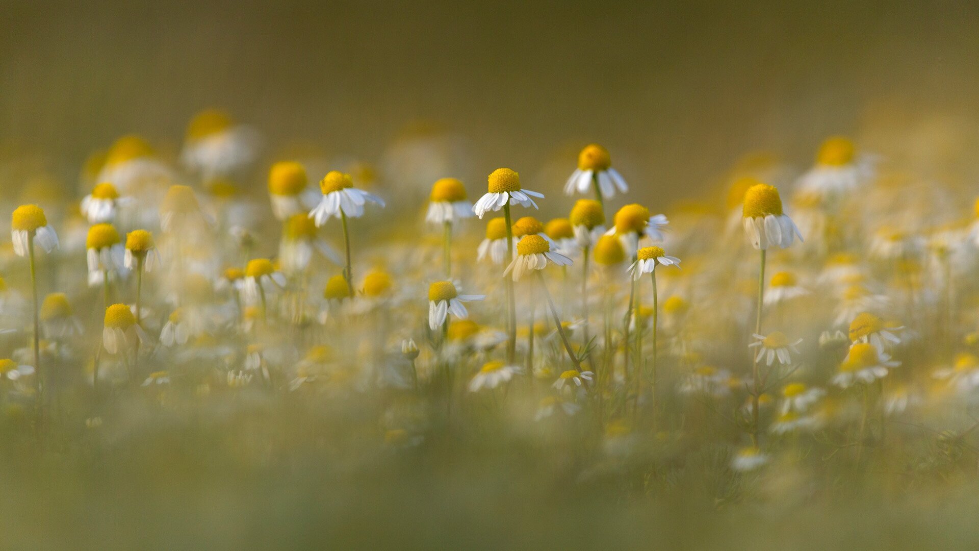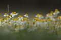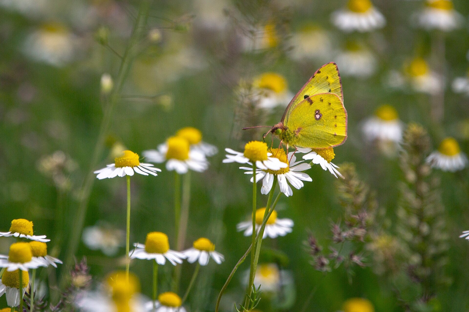A virágokat szivogató kéneslepkék teljesen beleolvadnak a sárgás kamillamezőbe