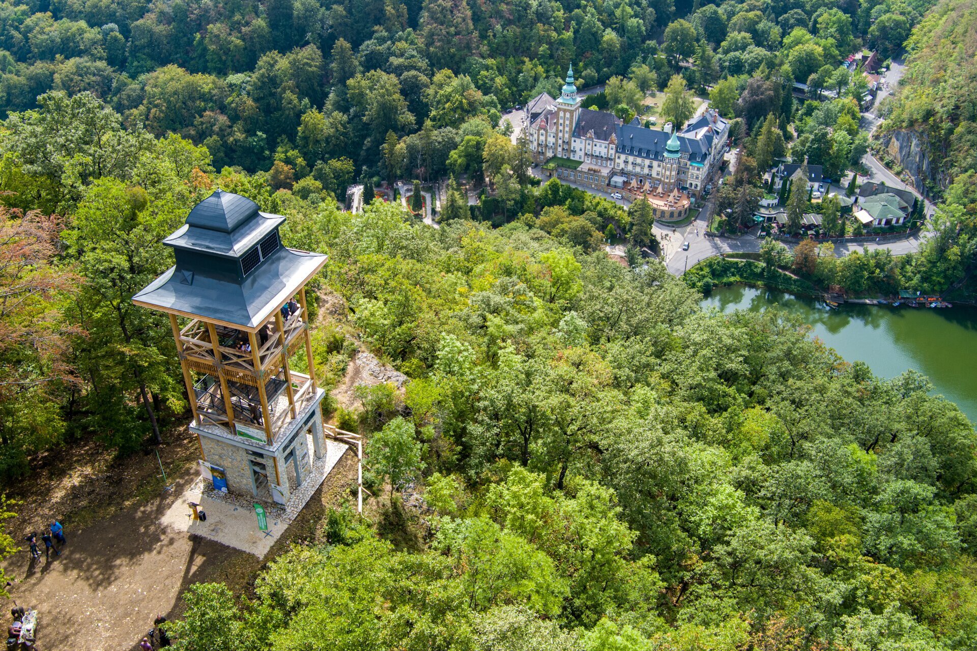 A vasbeton alapú, vörösfenyő gerendákból összeillesztett kilátóból remekül rálátunk a Palotaszállóra és parkjára
