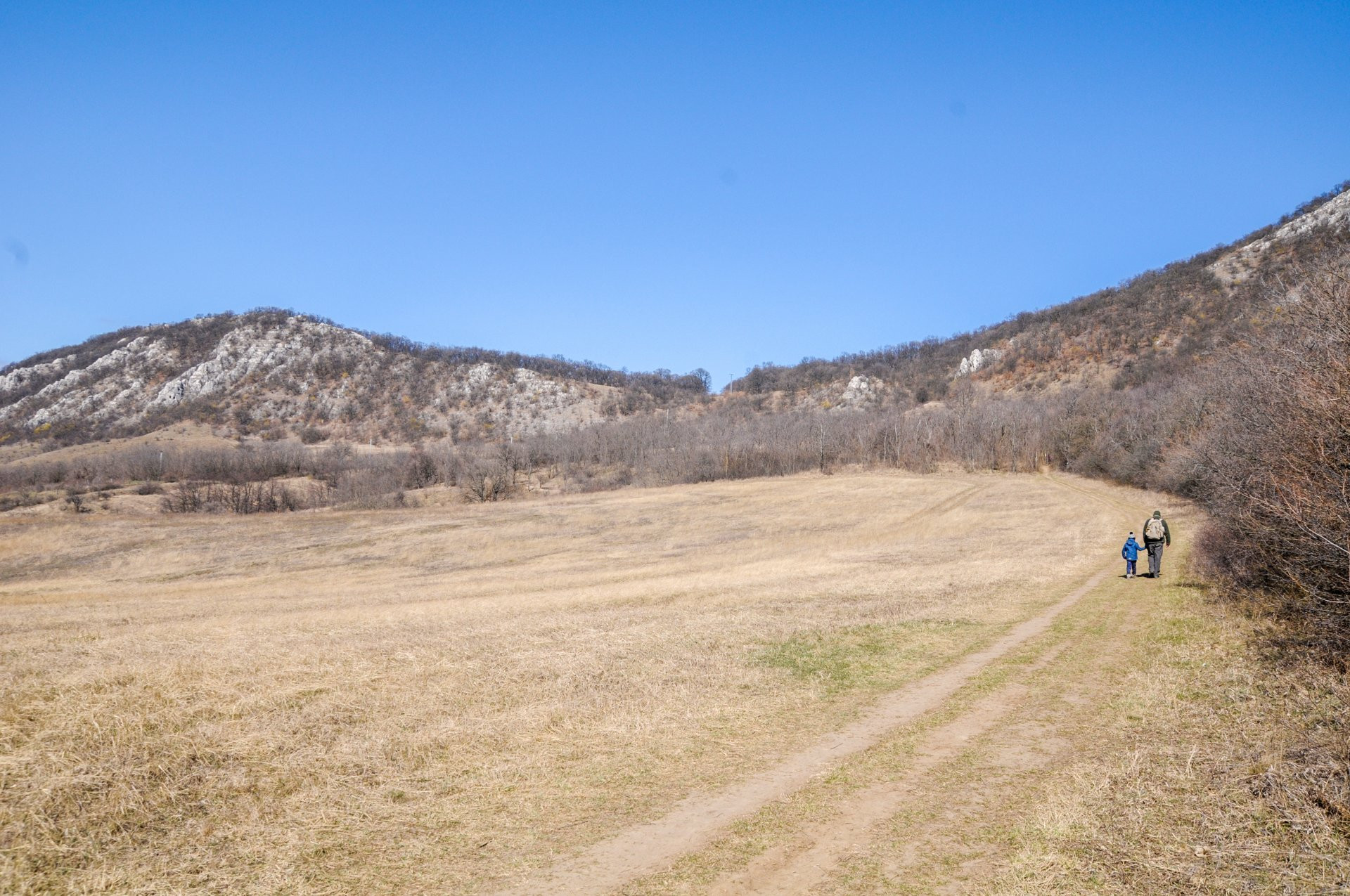 Útban a Kétágú-hegy felé. A képen a 424 méter magas Fehér-szirt látszik, mellette magasodik az 504 méter magas Öreg-szirt, amin a jelzett turistaút halad