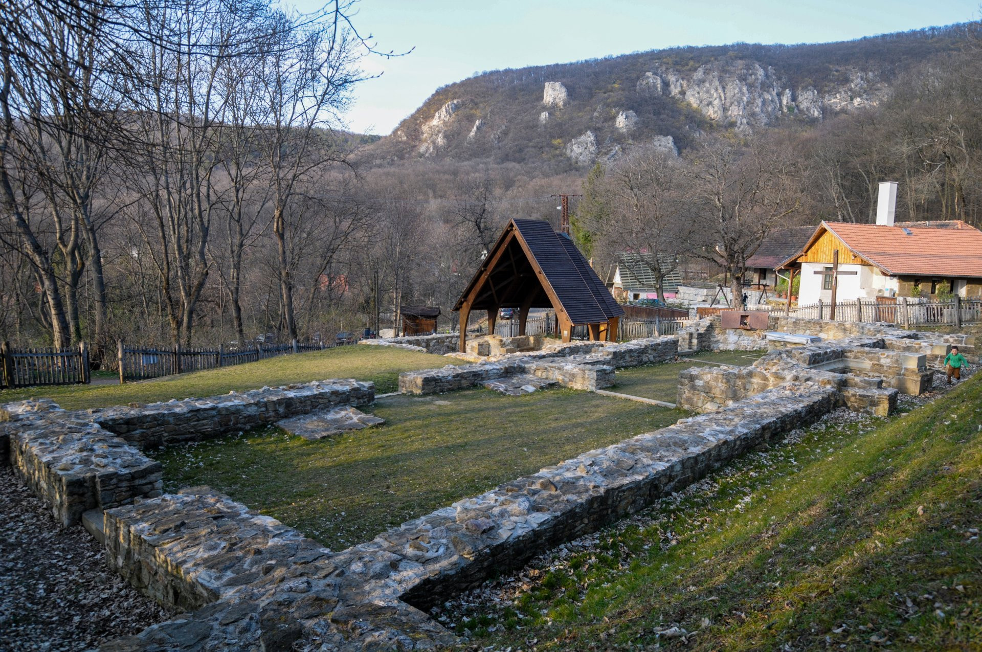A Klastrompusztai kolostor romjai, háttérben a Klastrom-szirtek és a jellegzetes Kémény-szikla