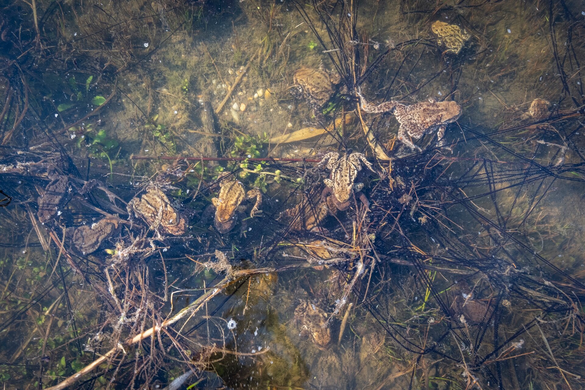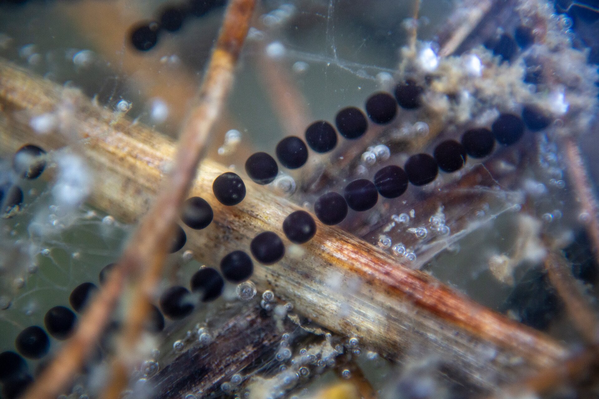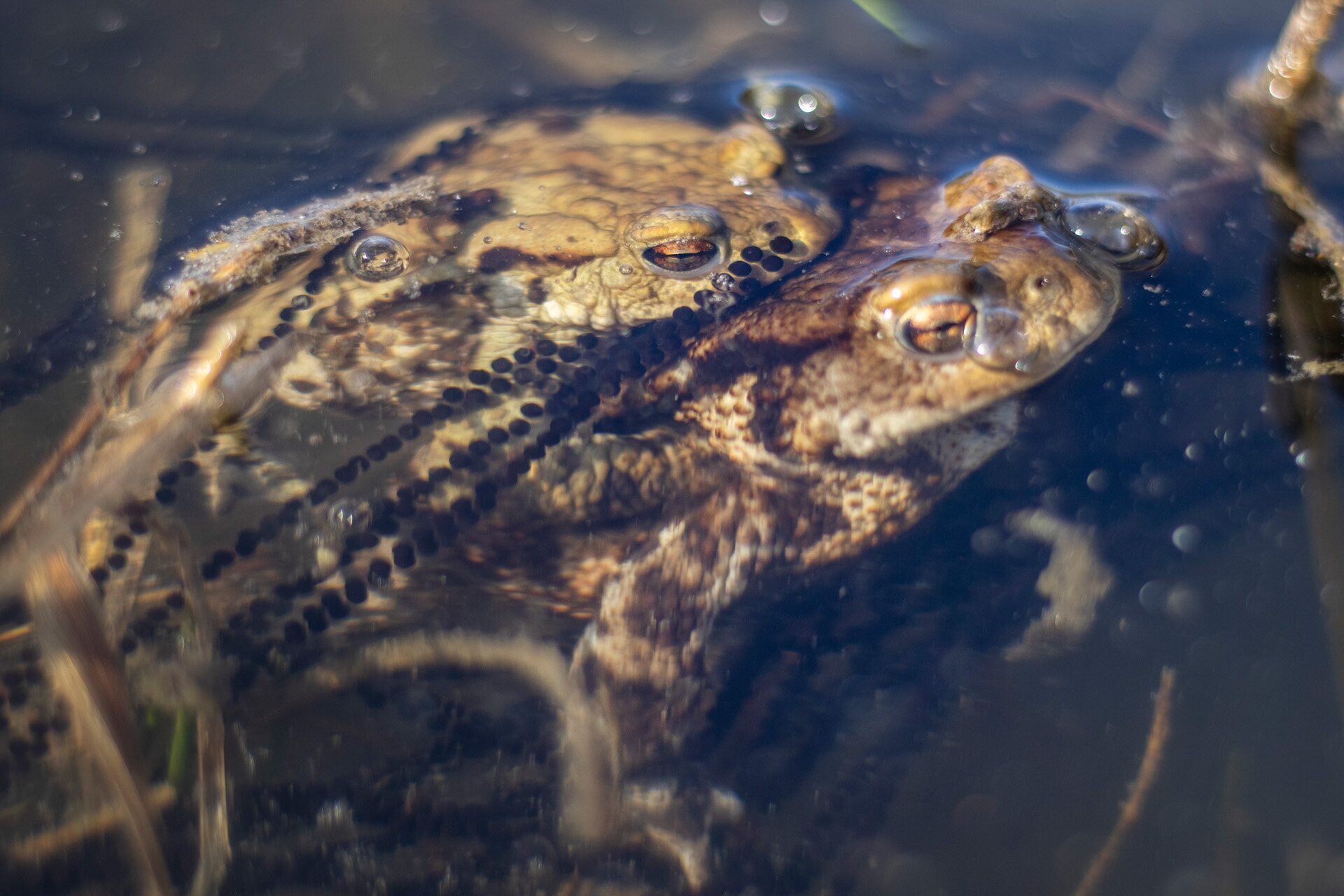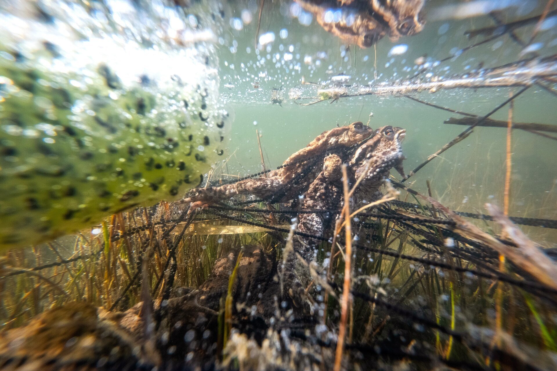 Bal oldalt egy erdeibéka-pár petecsomója a már farkincás embriókkal, háttérben egy barnavarangy-pár saját petefüzéreikbe gabalyodva