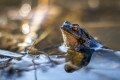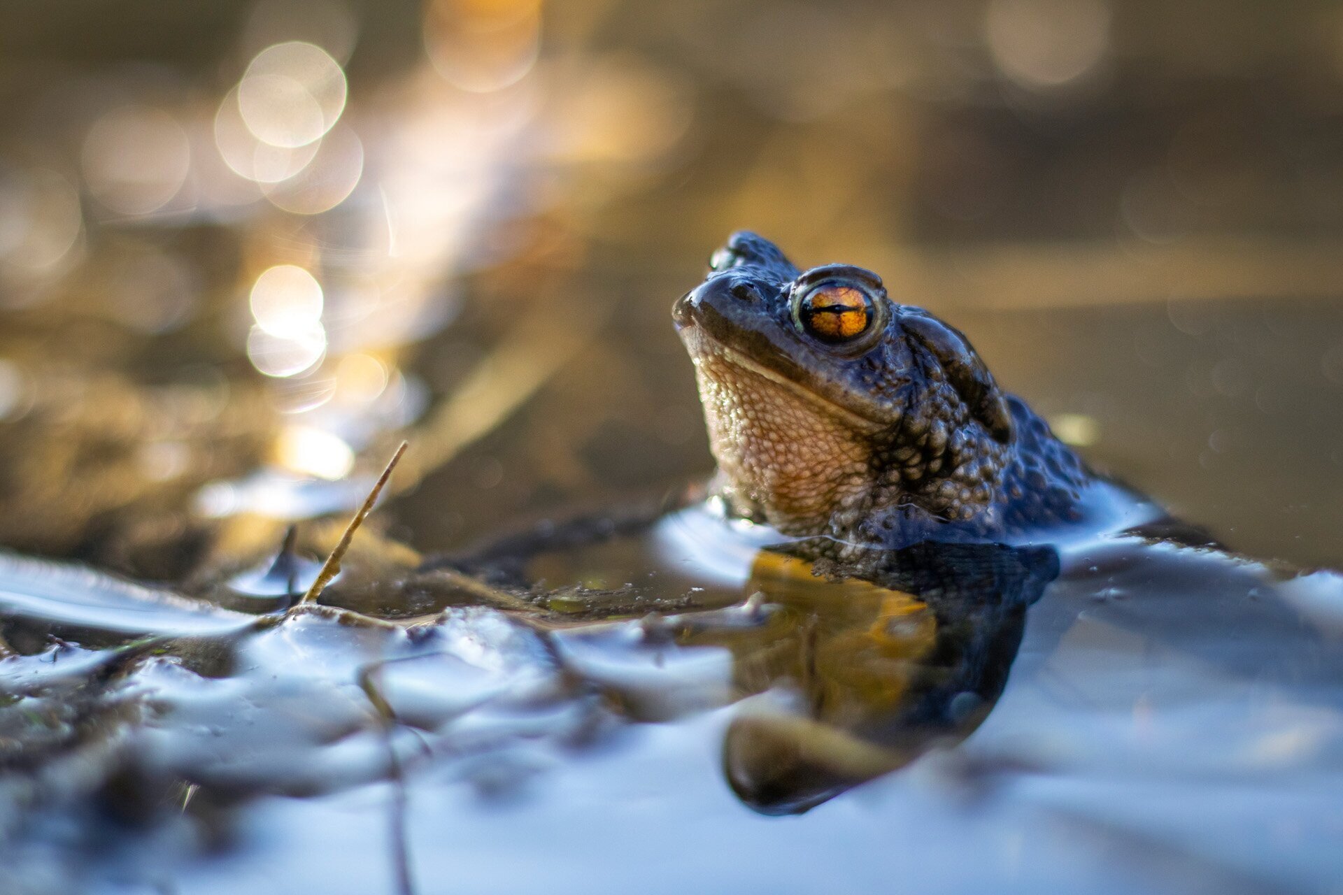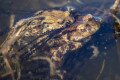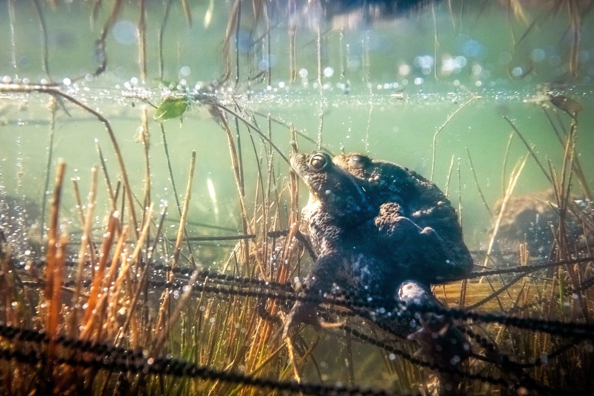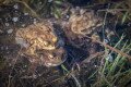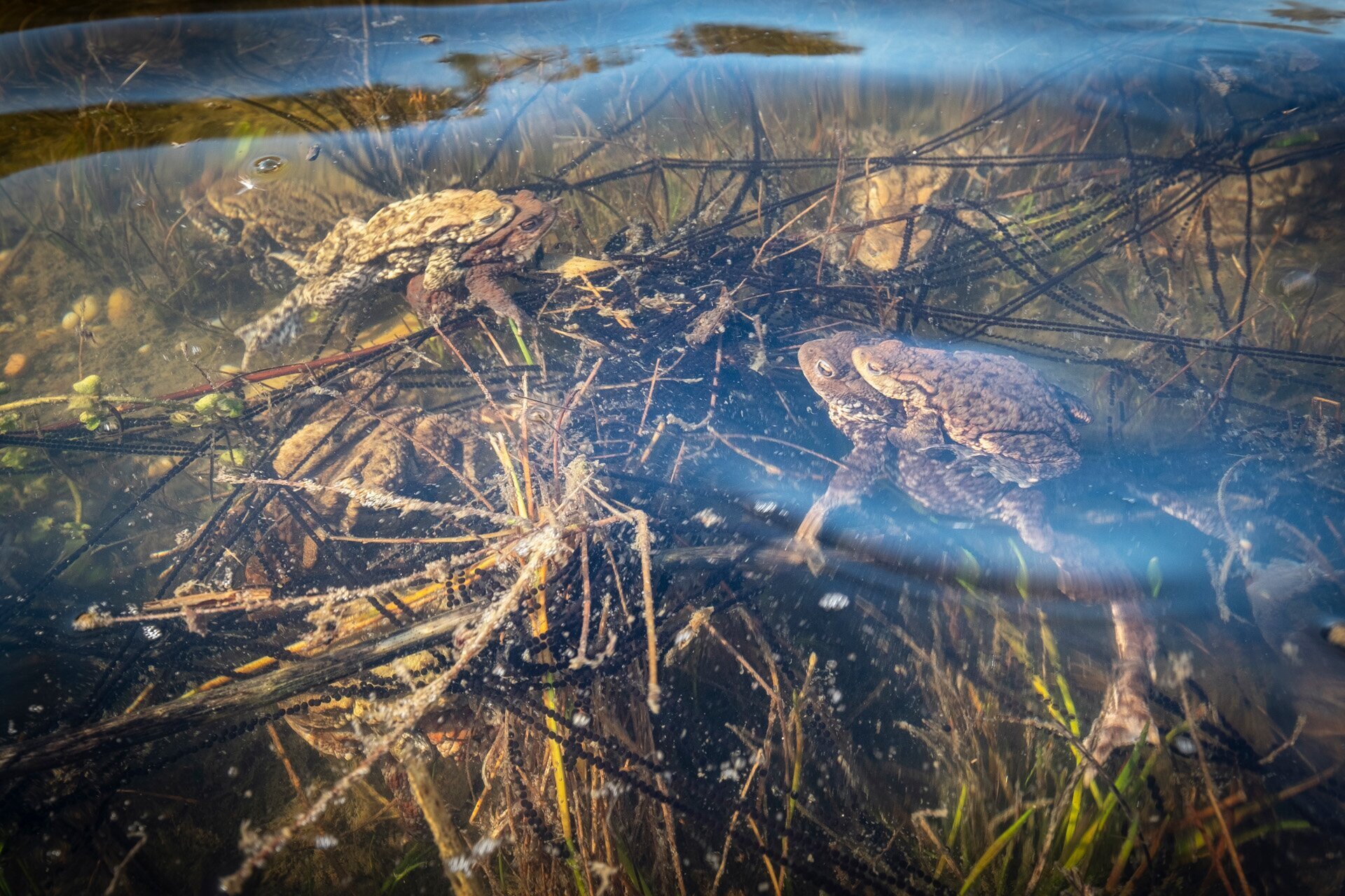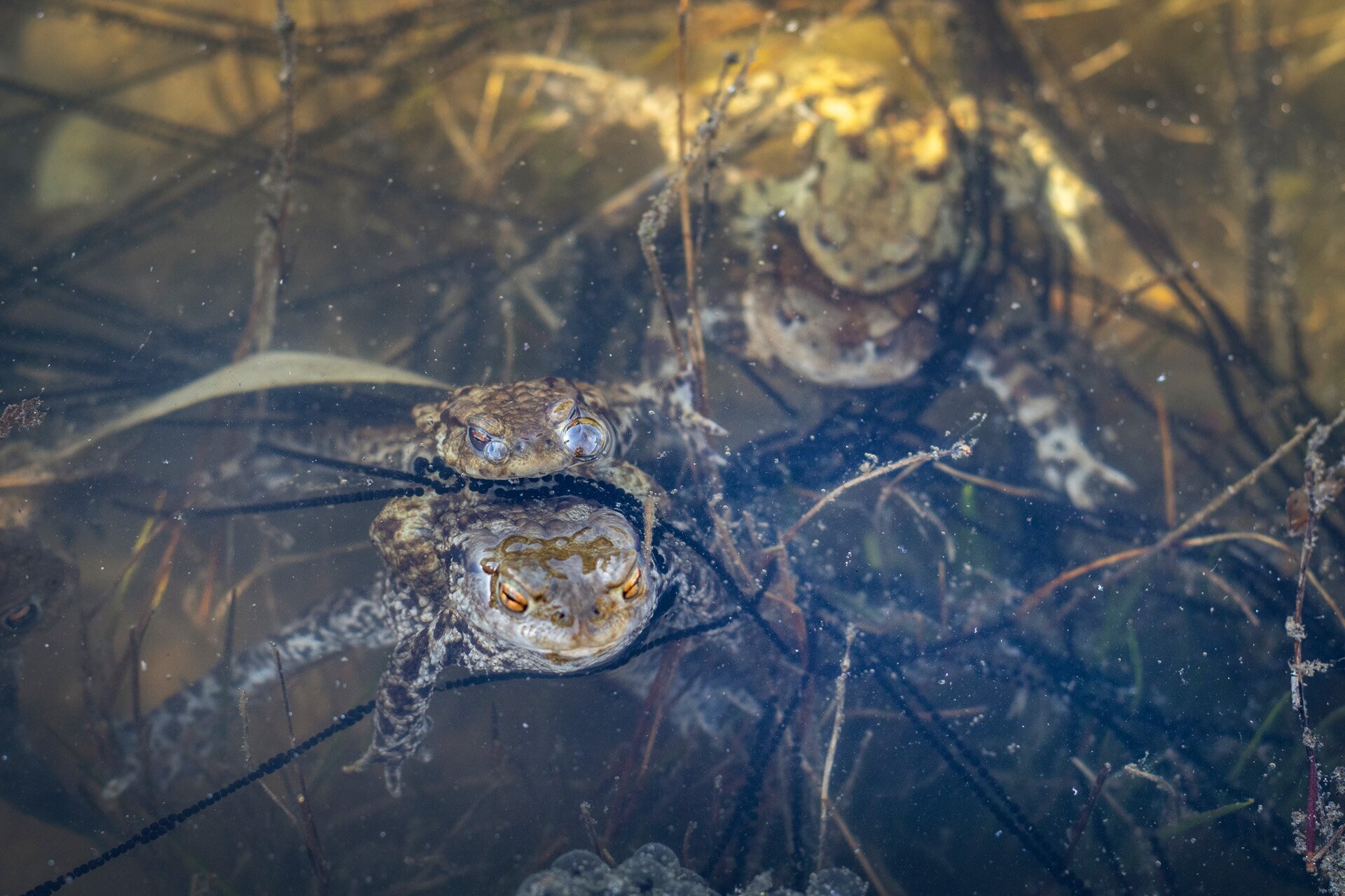 Bal oldalt egy erdeibéka-pár petecsomója a már farkincás embriókkal, háttérben egy barnavarangy-pár saját petefüzéreikbe gabalyodva