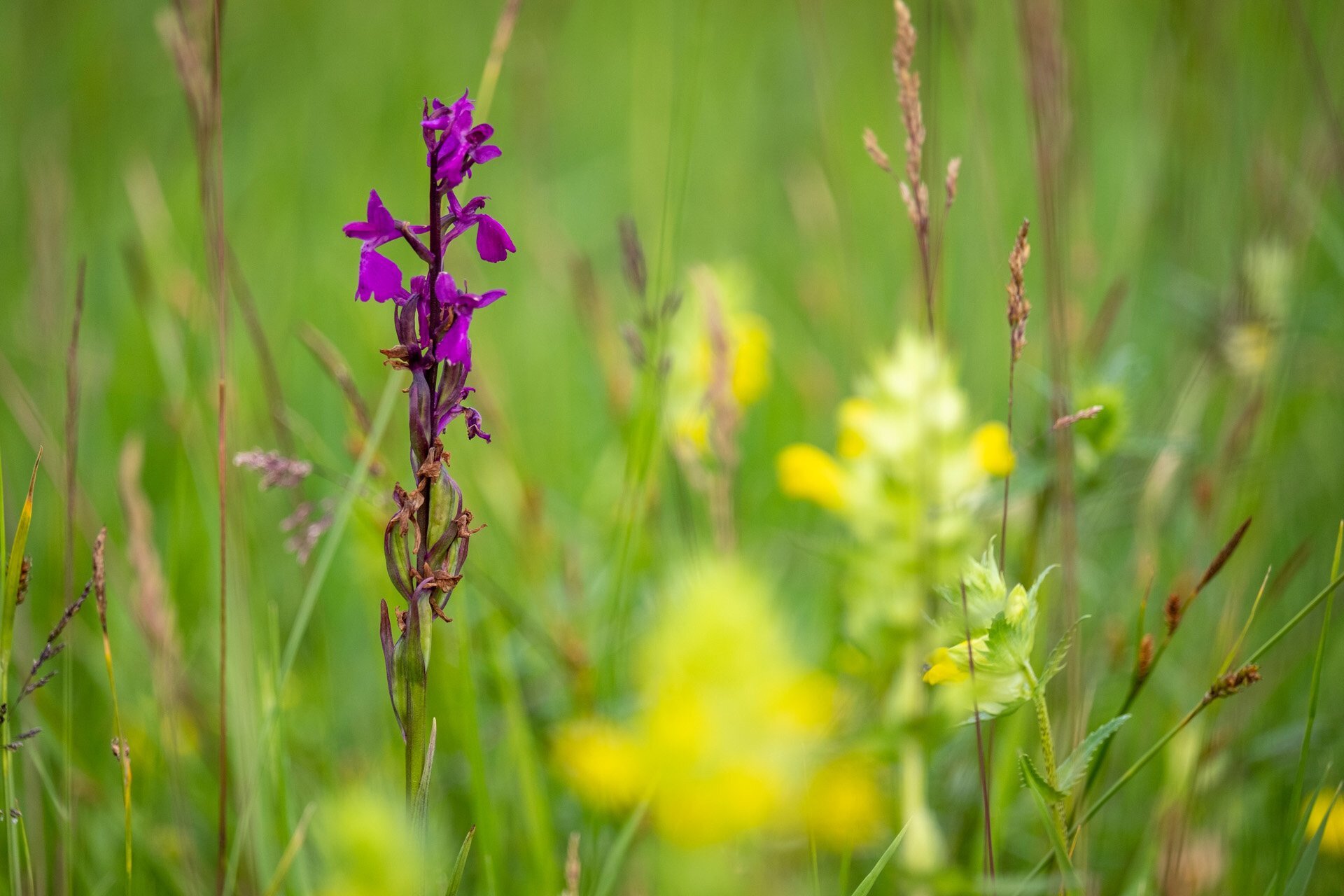 Mocsári kosbor a beszédes nevű csörgő kakascímerekkel körbevéve