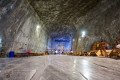 Interior of Praid Salt Mine. People hanging around. Wide shot. Romania