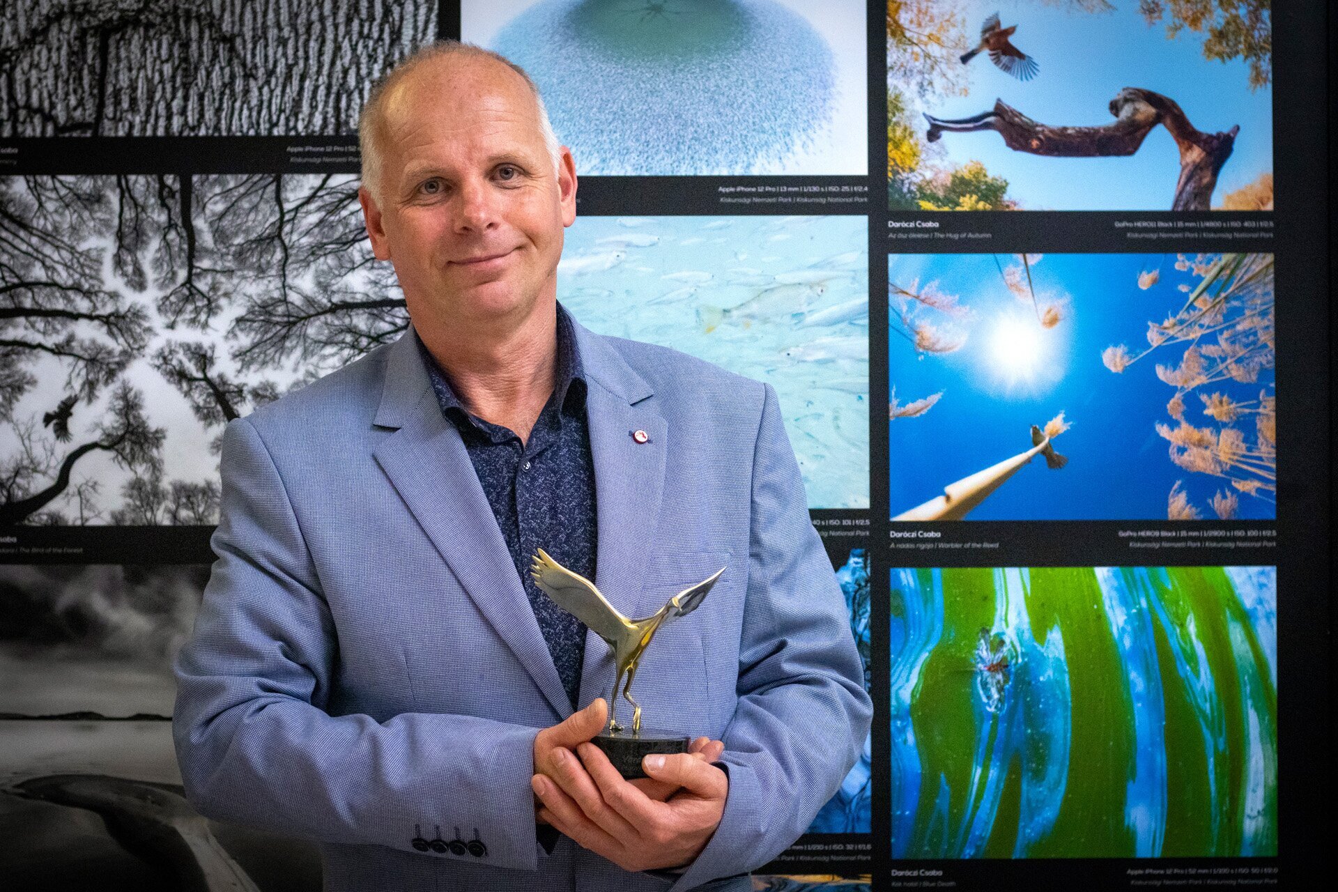 Daróczi Csaba fotói előtt az első helyezésért járó Arany Daru szoborral