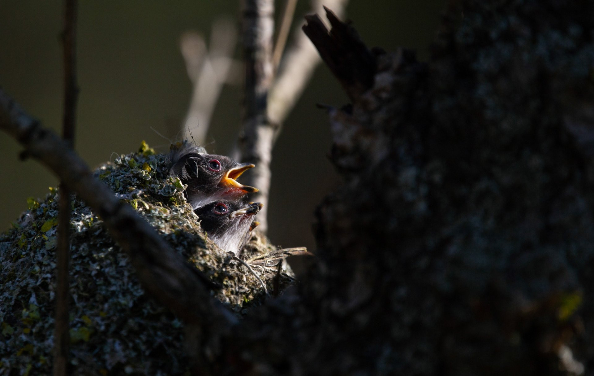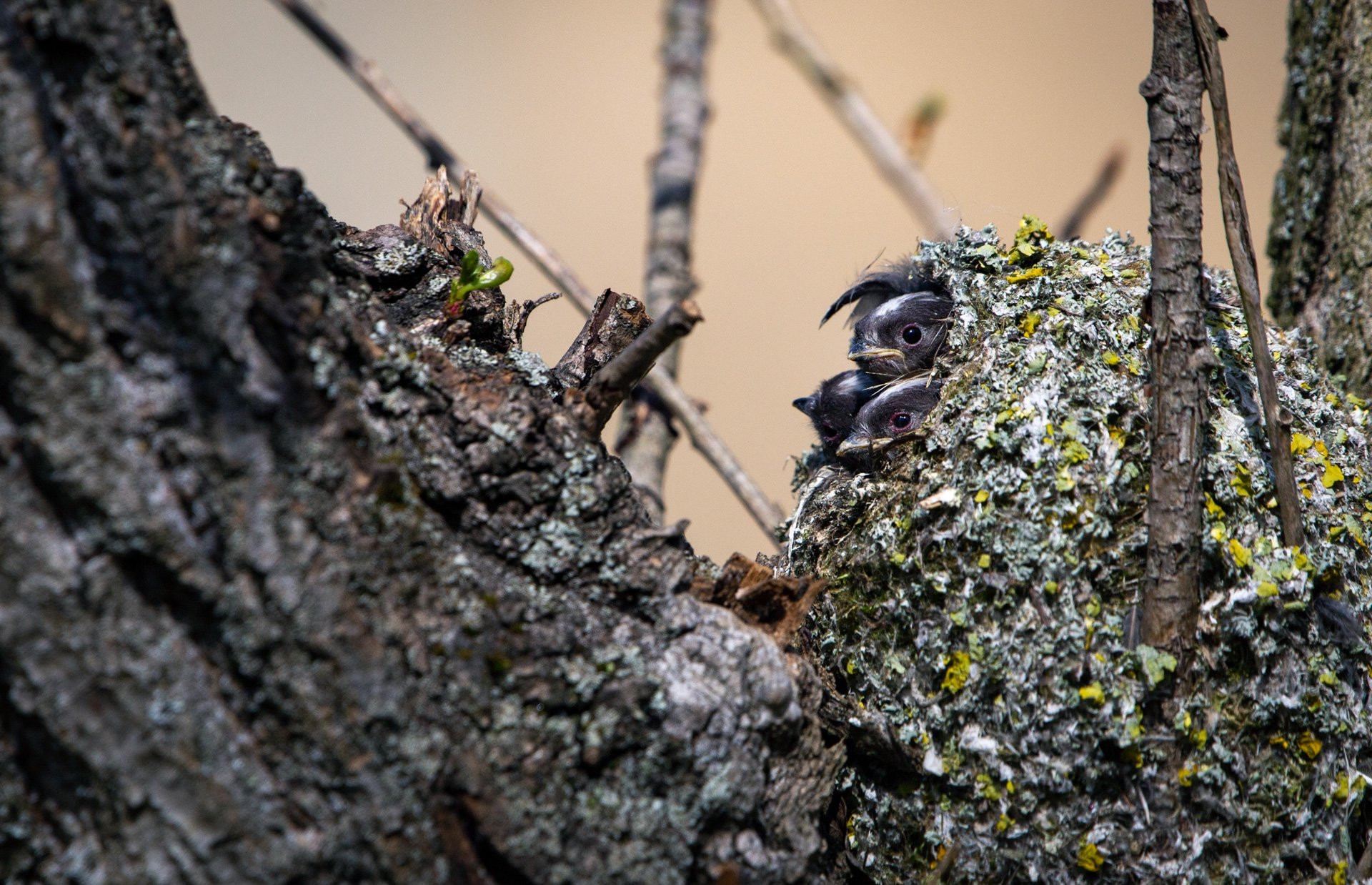 Míg a szülők újabb adagért mennek, a kis fiókák kíváncsian nézelődnek. Messziről alig lehet észrevenni a fészekből kukucskáló buksikat, ráadásul a fészek alacsonyan is van, ágas-bogas faágak között, így természetes ellenségeik, a szarkák, varjak se tudják könnyen kiszúrni és megközelíteni őket. Nem úgy a szabadon lófráló kutyák. Sajnos saját szememmel láttam, ahogy szagot fogva indult meg egy póráz nélküli eb a fészek felé. Szóltam a gazdának, hogy hívja vissza a kutyát, persze azt hitte én tartok tőle, fogalma sem volt, hogy épp egy fiókákkal teli fészekre startolt rá.