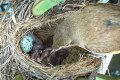 Valami kikelt. De ez egy nádirigófióka. A mellette lévő folttalan tojás lesz a kakukké. Érdekes, mert egyszerre kezd rájuk ülni a kotló szülő, és a kakukk egy nappal előbb szokott kikelni