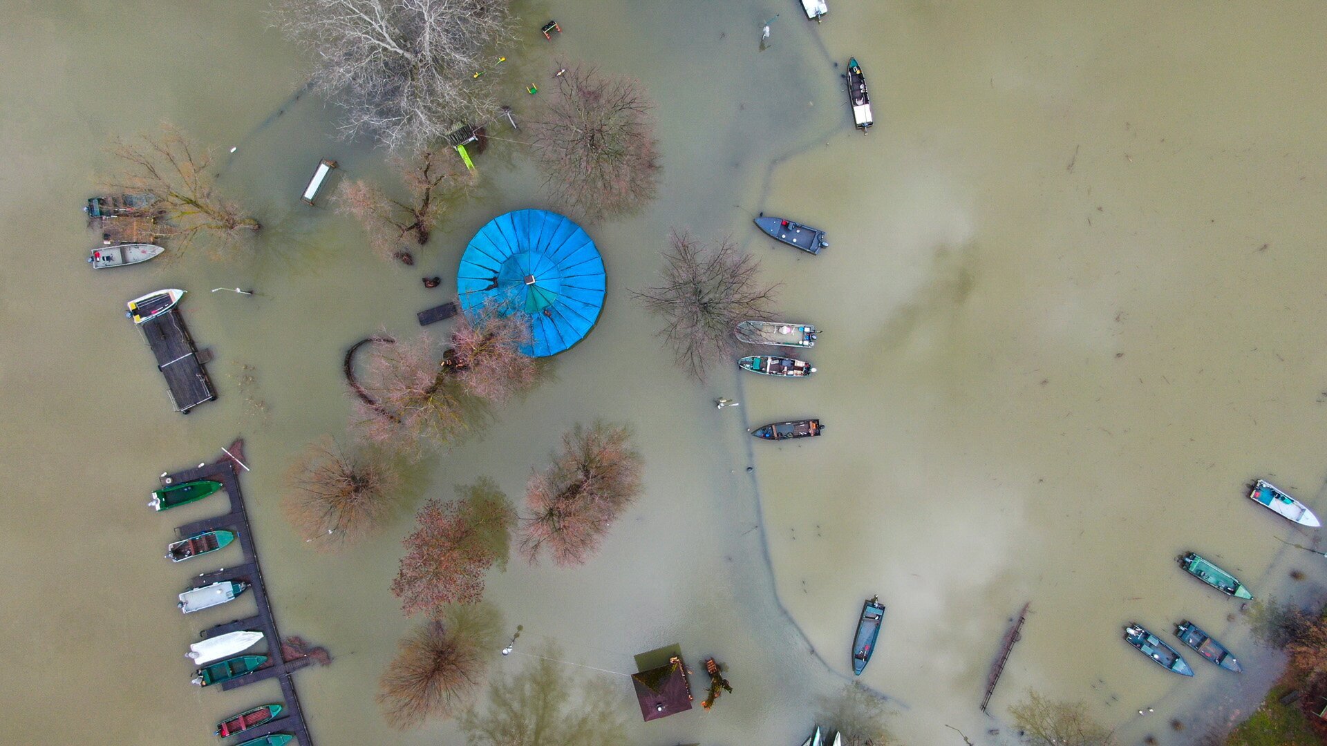 Az elárasztott Kormorán kikötő fentről, ahonnan még valamennyire látszik a part vonala