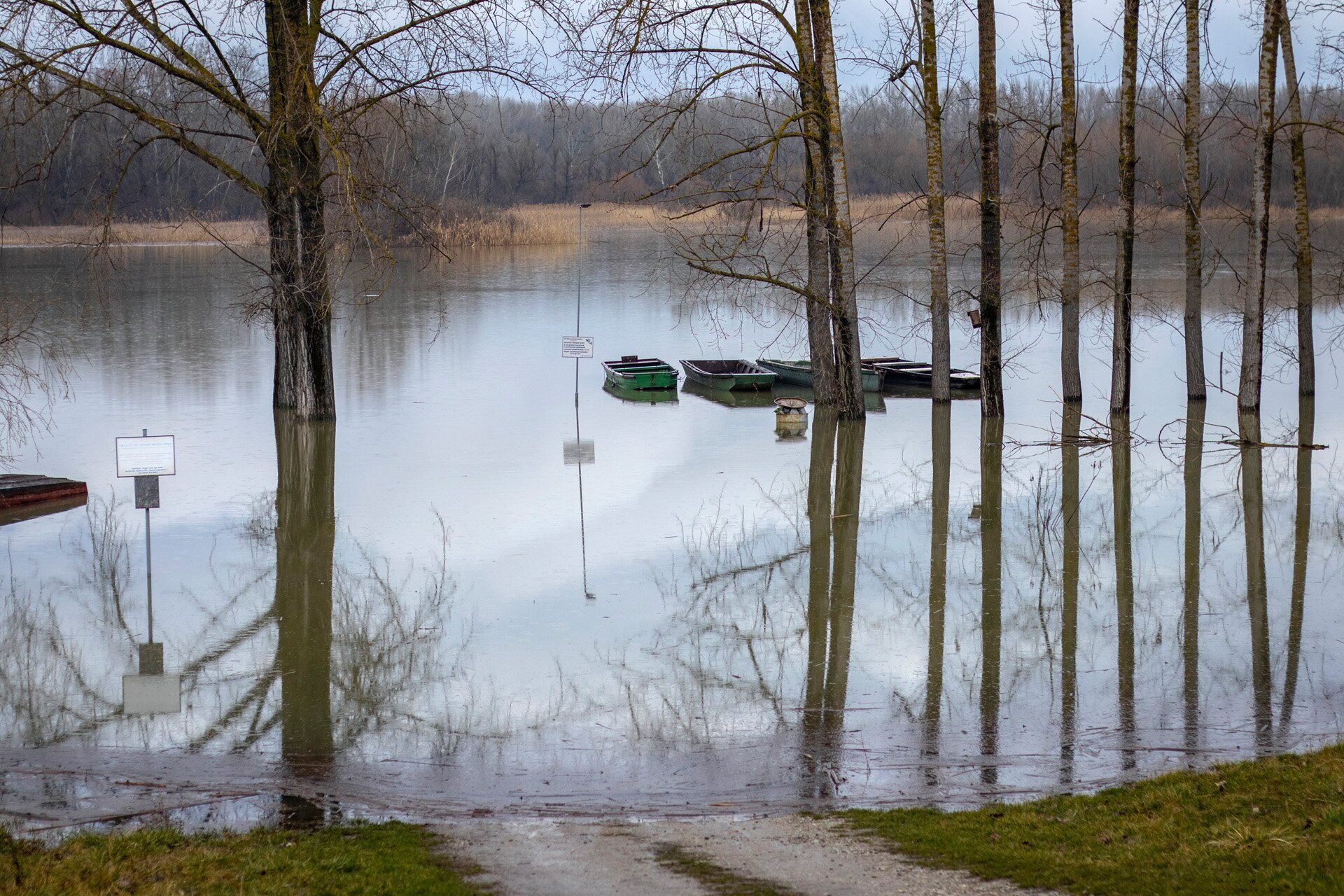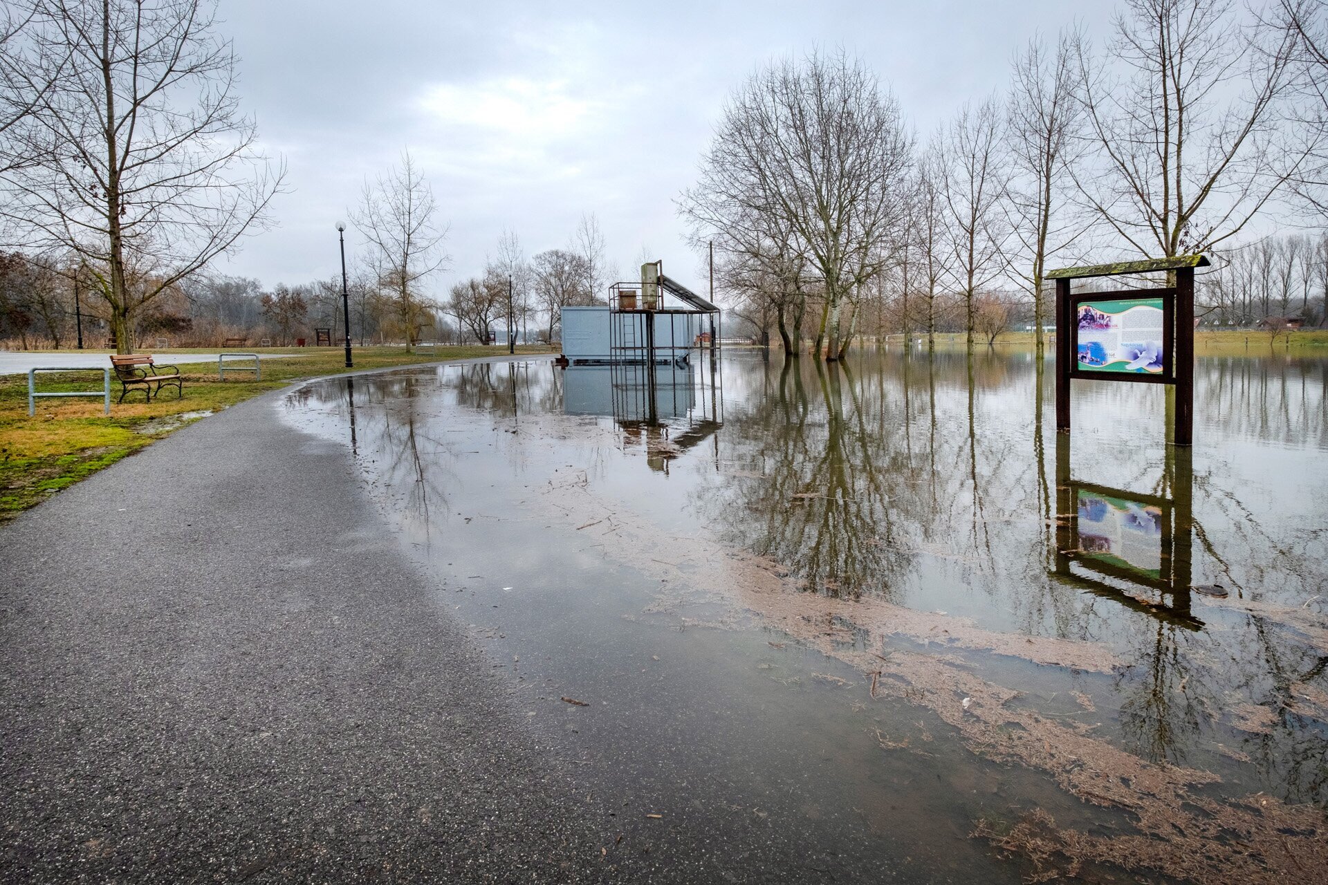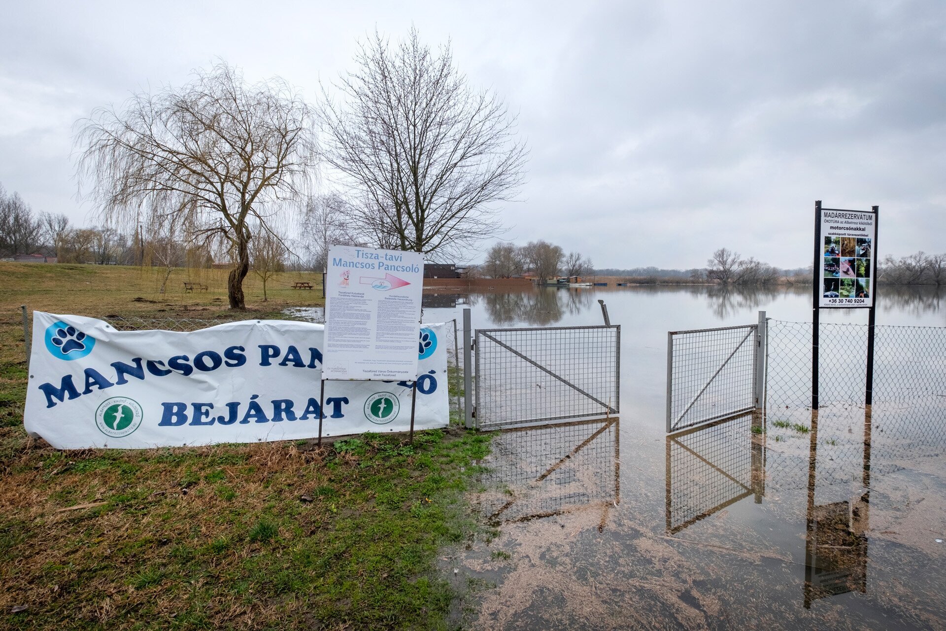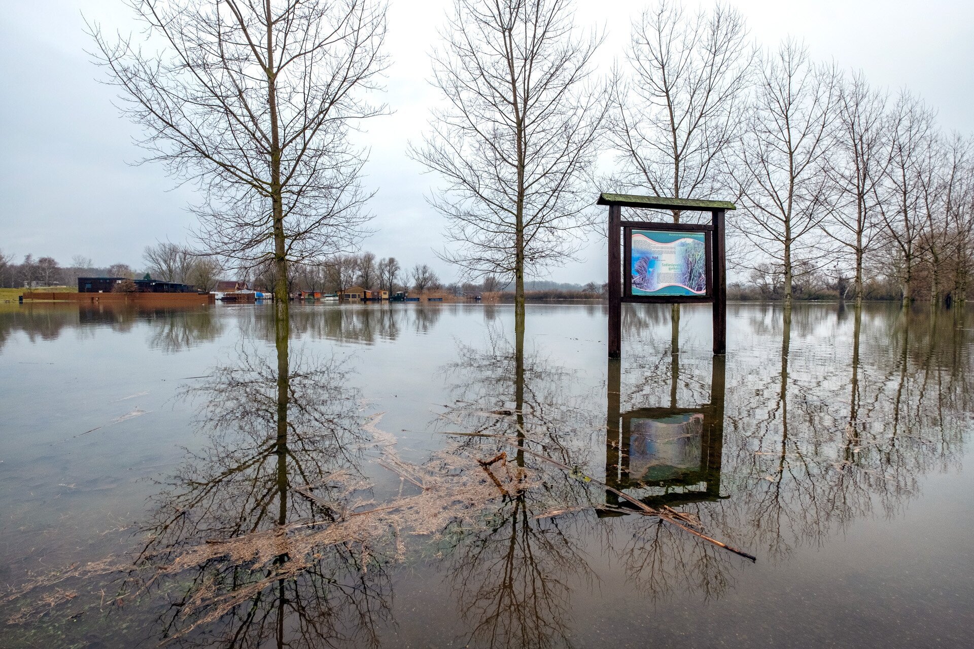 Ezt az ismeretterjesztő táblát most csak gumicsizmában tudnánk elolvasni a tiszafüredi Morotva kerékpáros pihenőparkban