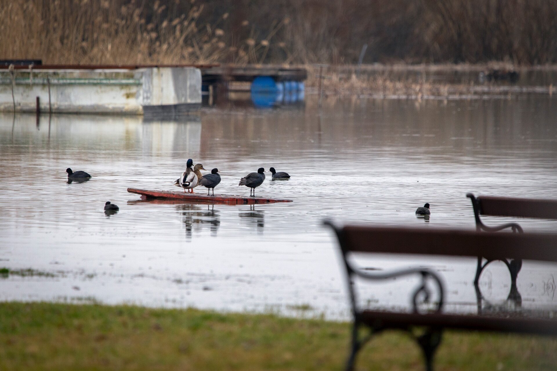 A tőkés récék és szárcsák nagy örömmel foglalják el az asztalból spontán létrejött kis szigetet