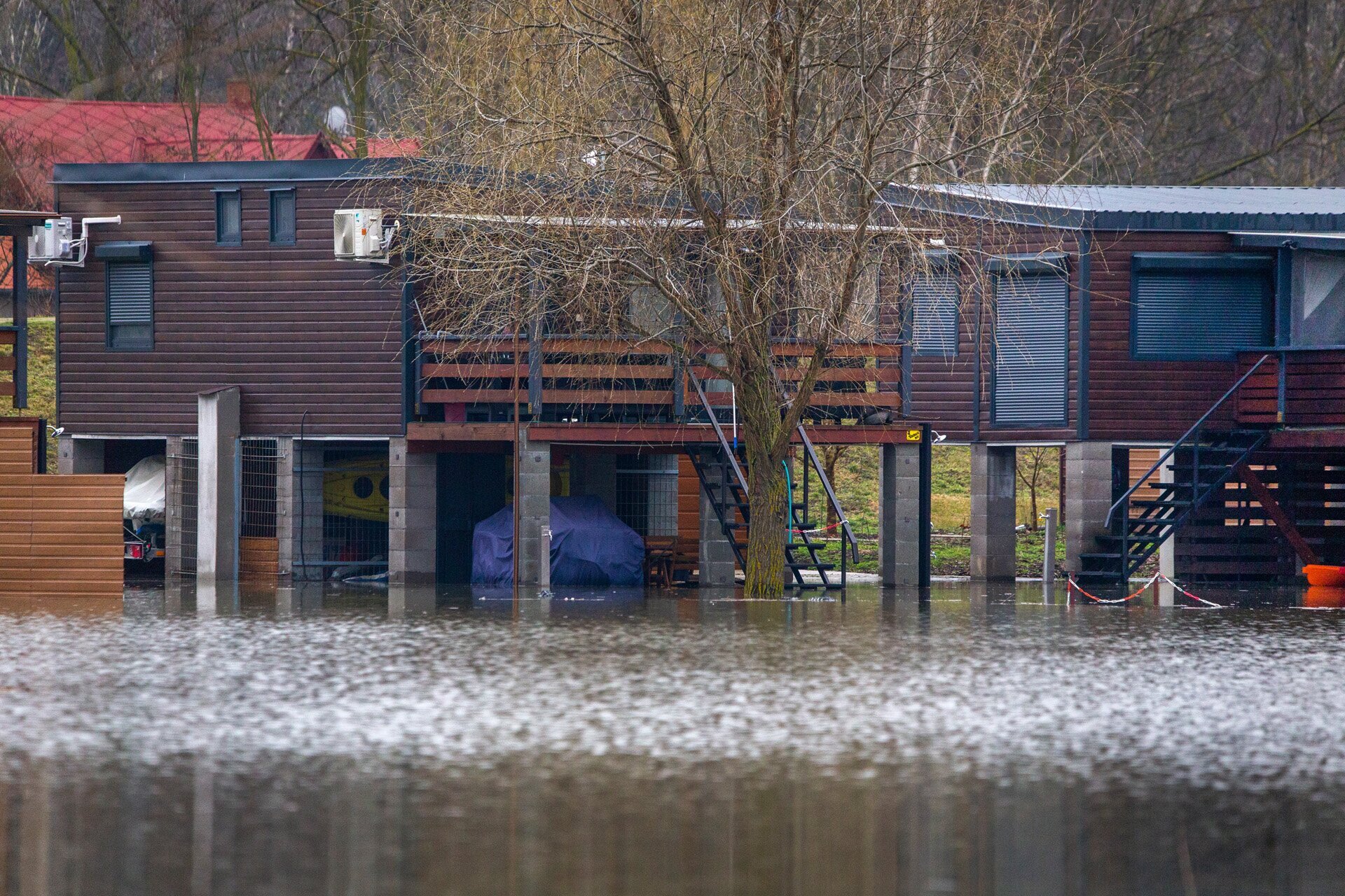 A tiszafüredi Albatrosz kikötőben is a víz vette át az uralmat. A fixen itt tárolt lakókocsik most kapnak egy kis alvázmosást