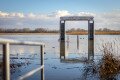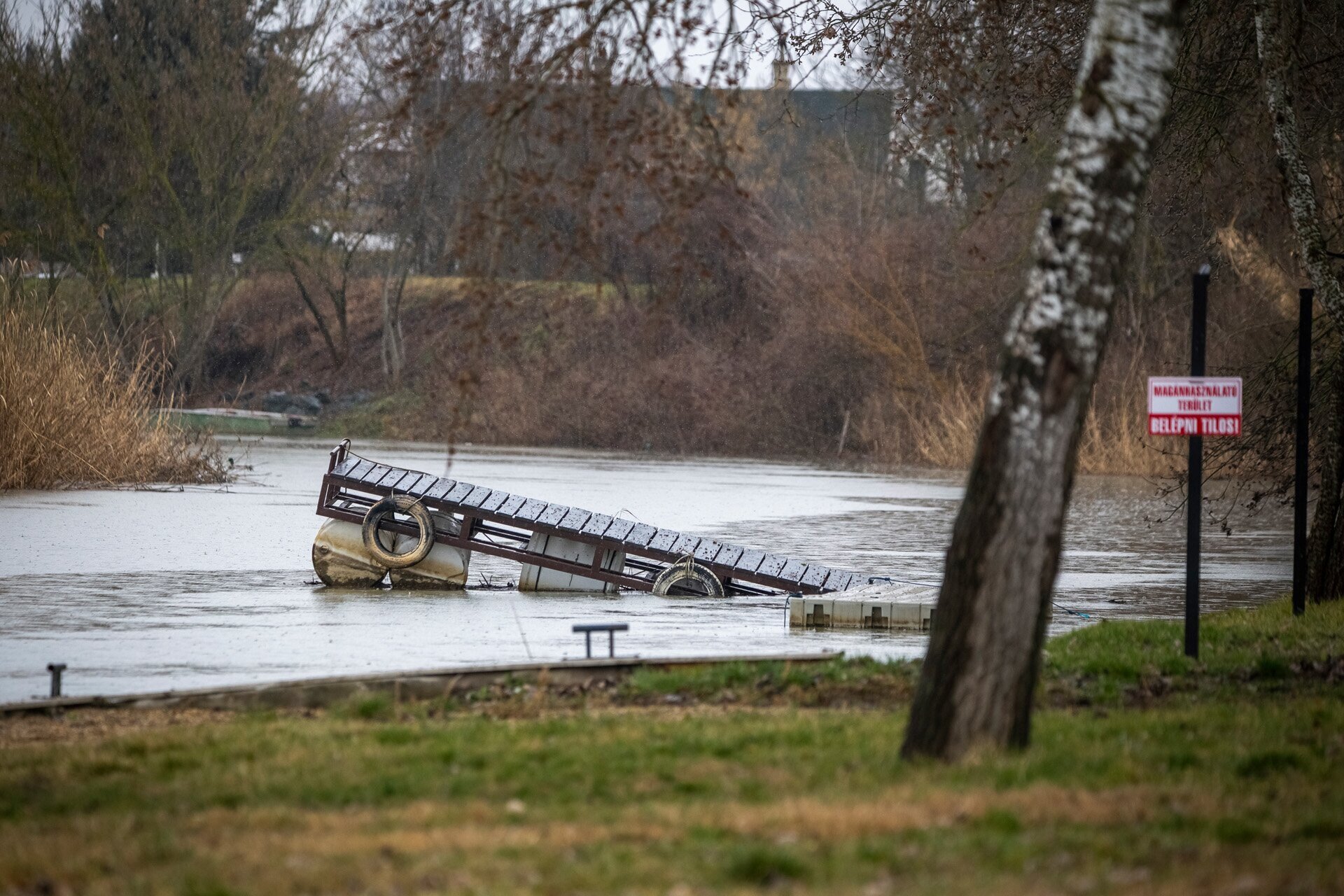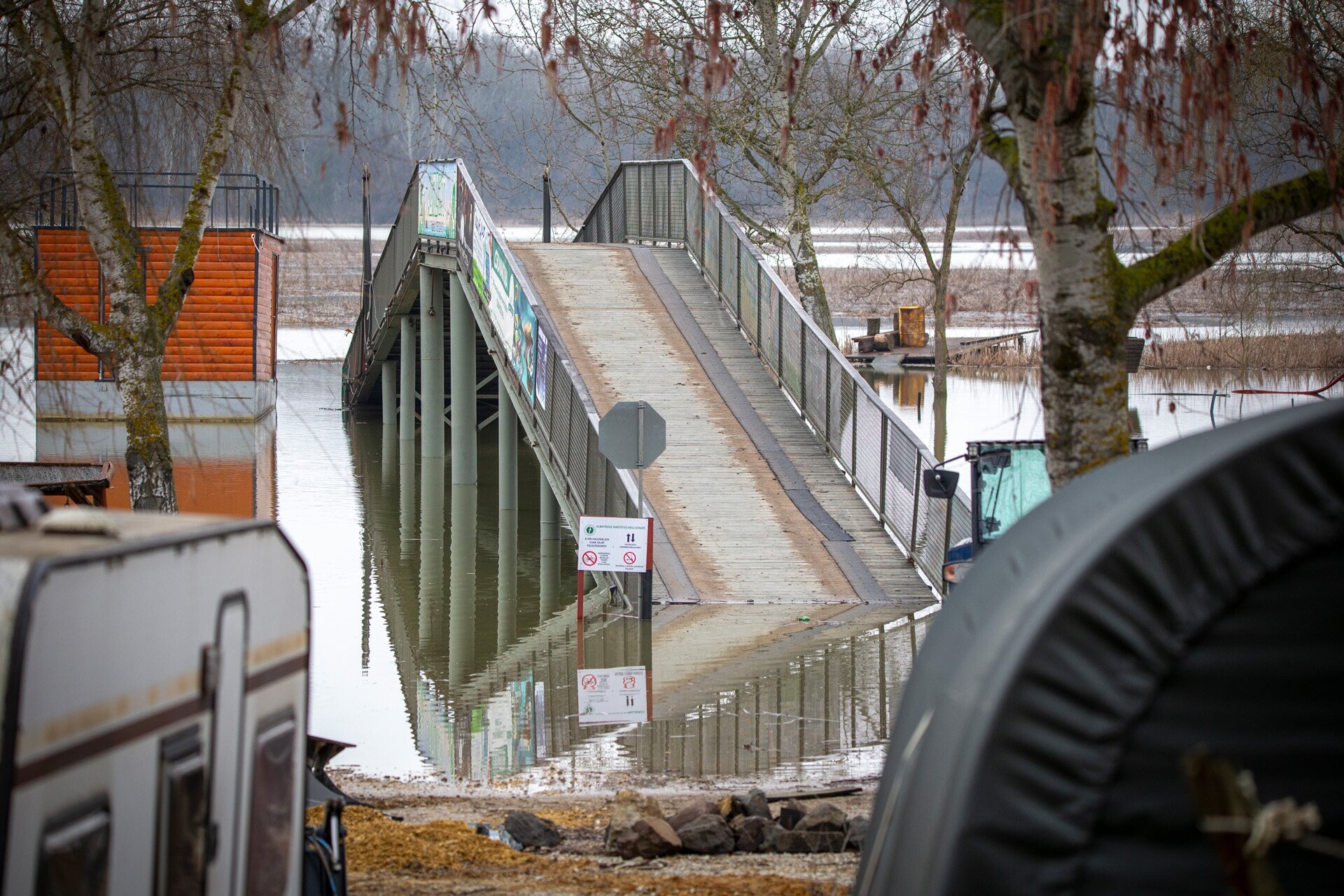 Parthoz fixált lebegő stég meredezik az ég felé a magas vízszint miatt Tiszaörvénynél