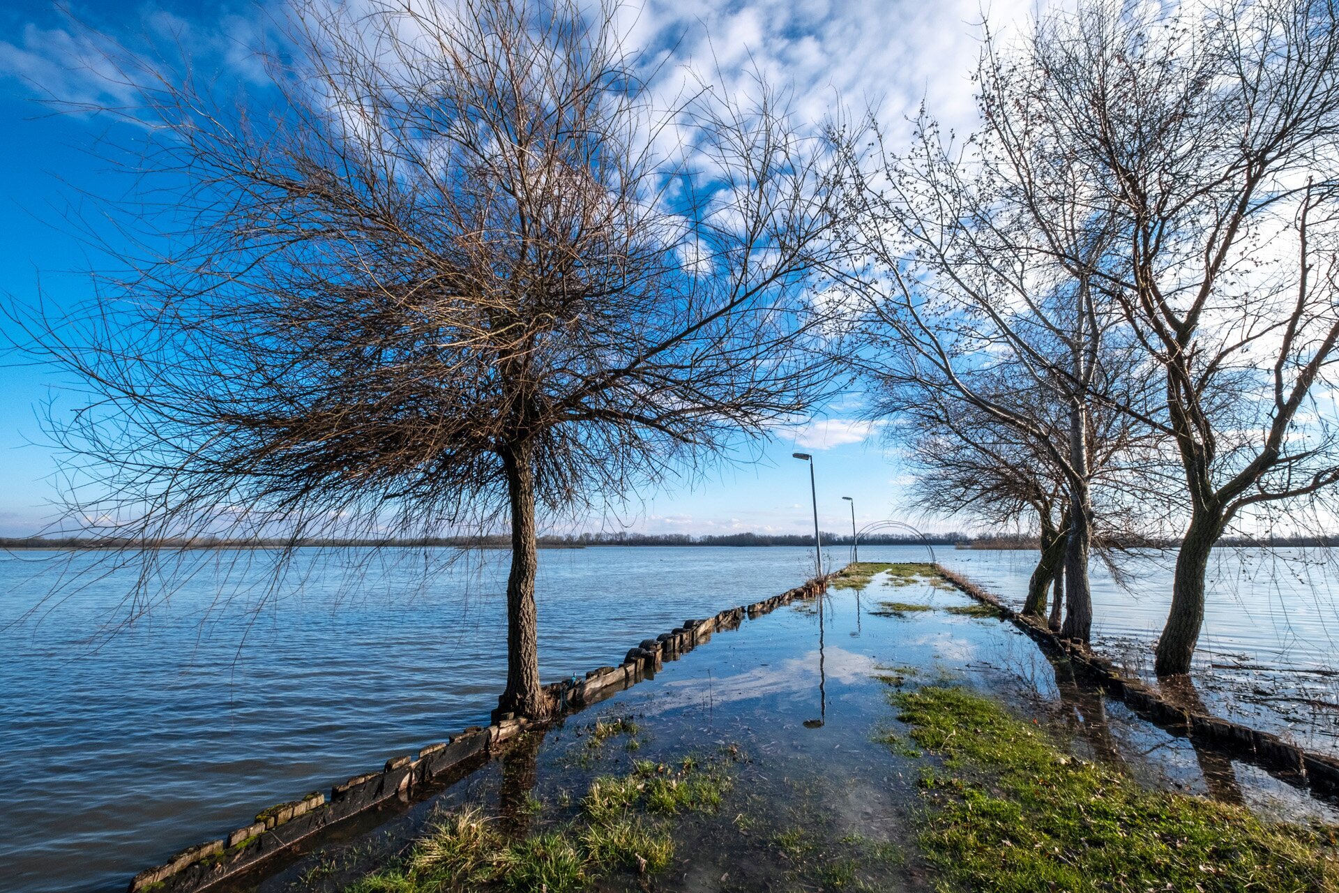 Ez már a Kis-Tisza, a 33-as út mellett, ahol a víz egészen a bicikliútig ér.. A zsilip zárva van, és a Tisza felől a víz teljesen elárasztott mindent, a Kis-Tisza is kilépett medréből