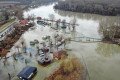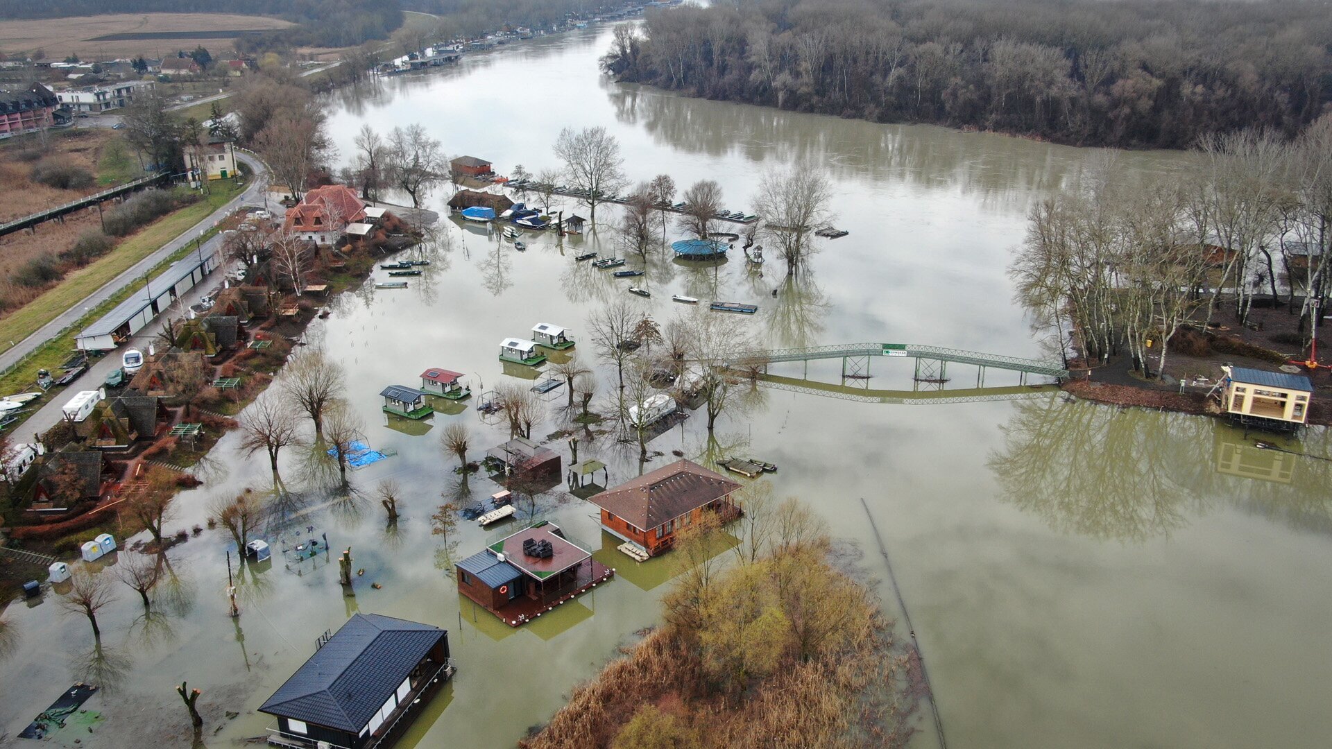 A Kormorán kikötőt is elárasztotta a víz, nem csoda, hiszen közvetlenül a Tisza mellett van. A kép tetején kanyarodó Tisza vize normális vízállásnál a híd alatt jön csak be a Füredi-Holt-Tisza felé, de most mintha egy nagy tó alakult volna ki itt is