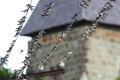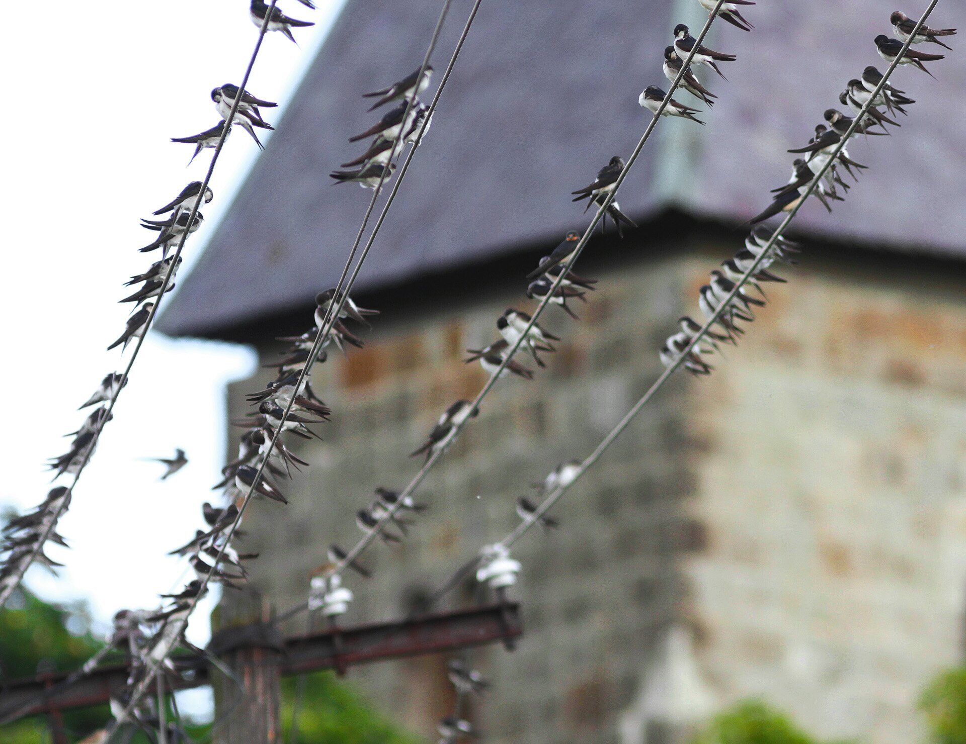 Gyülekező fecskék a bodrogolaszi római katolikus Szentháromság-templomnál