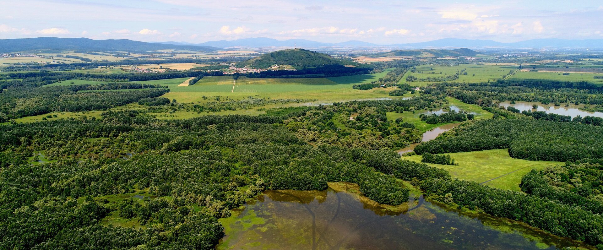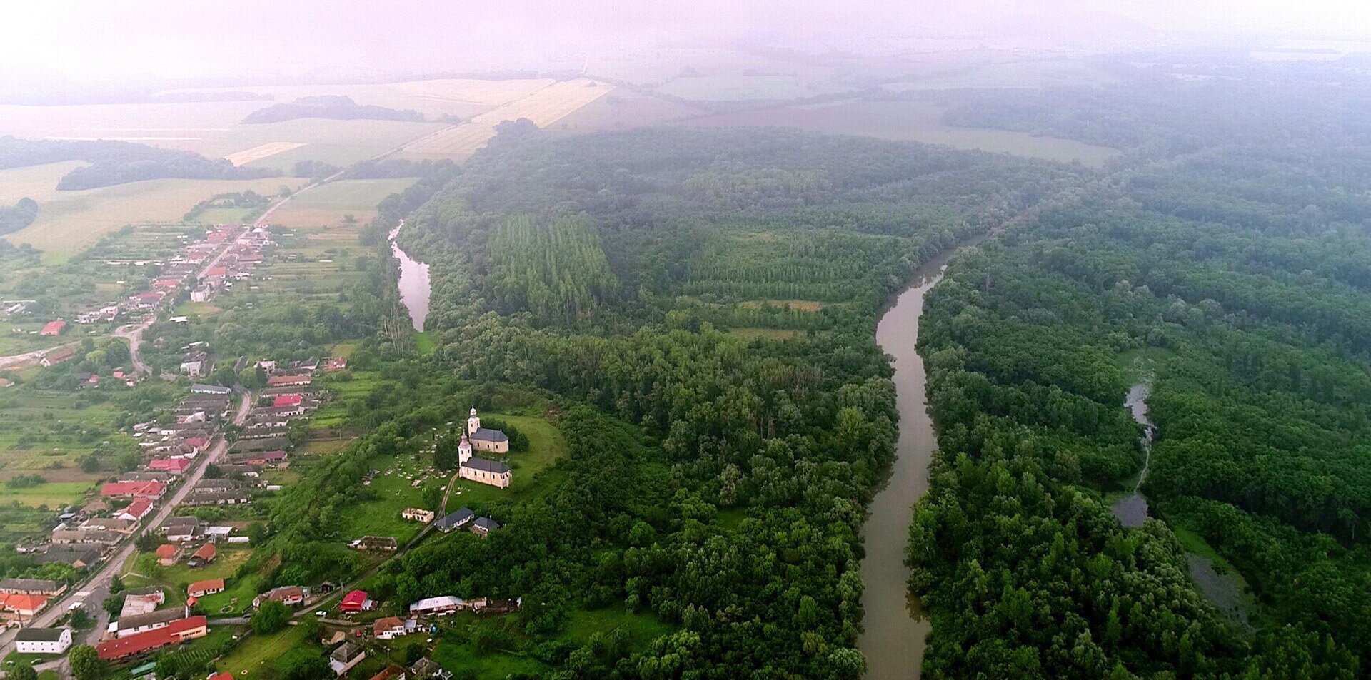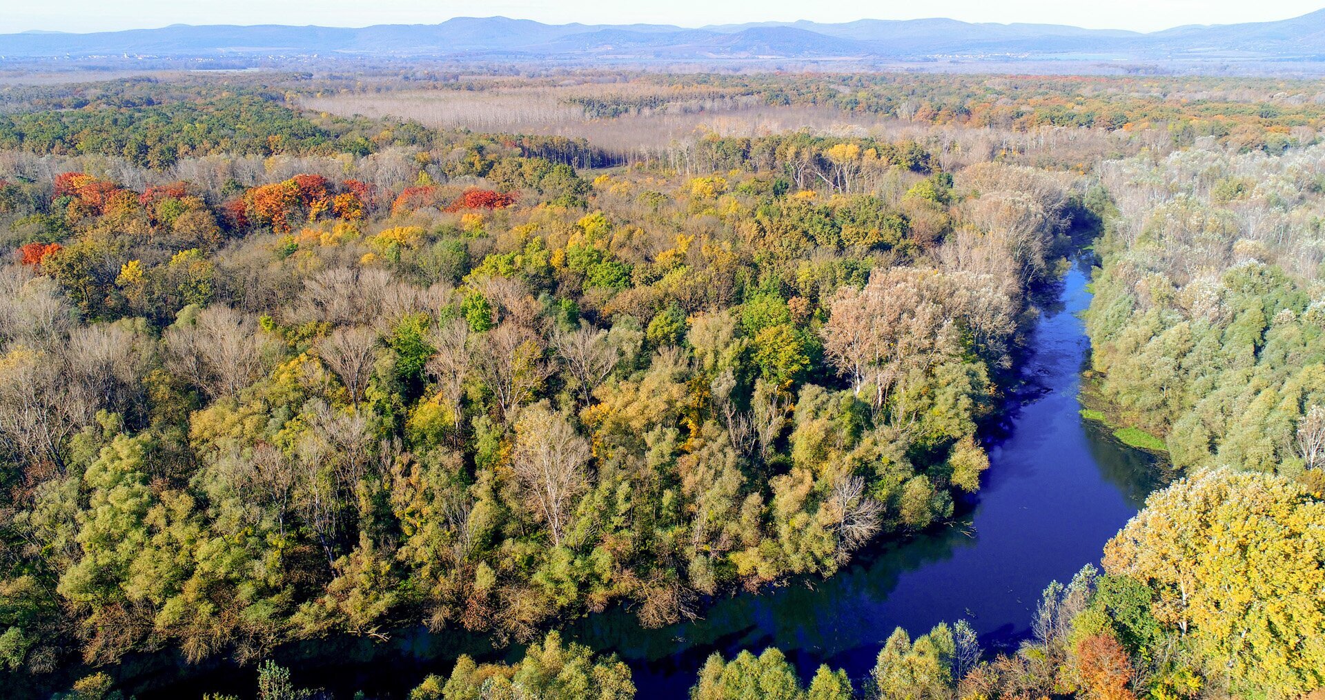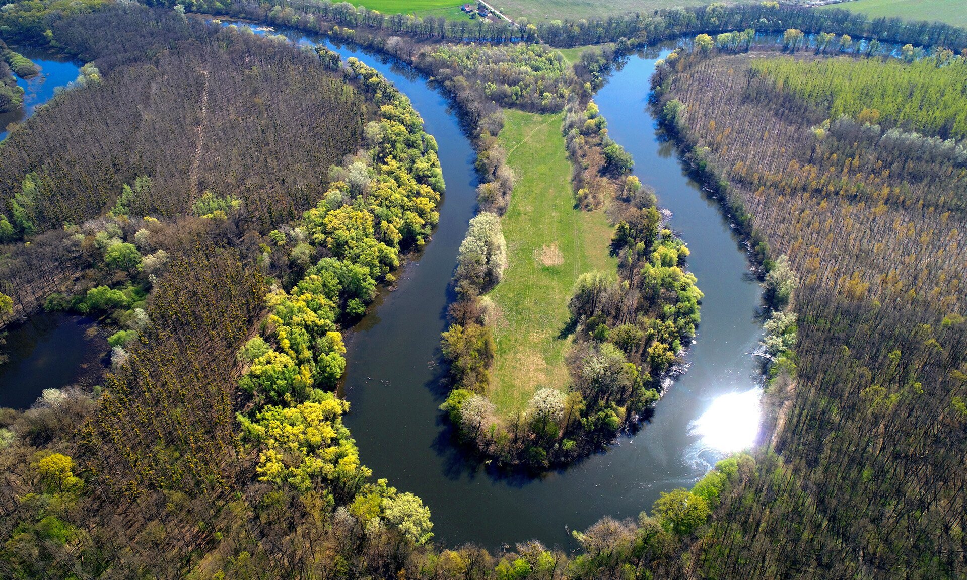 A Bodrog kanyarulata Szőlőskétől délnyugatra, háttérben a „Sátoros-hegyek" Sátoraljaújhely mögött