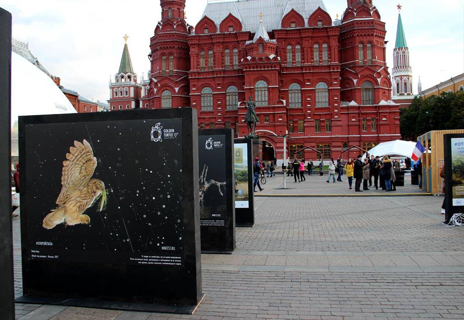 Kiállítás a Manyezsnaja téren 2016-ban, előtérben Kércz Tibor Esőben repülve című fotója. (Pályázaton kívüli kép)