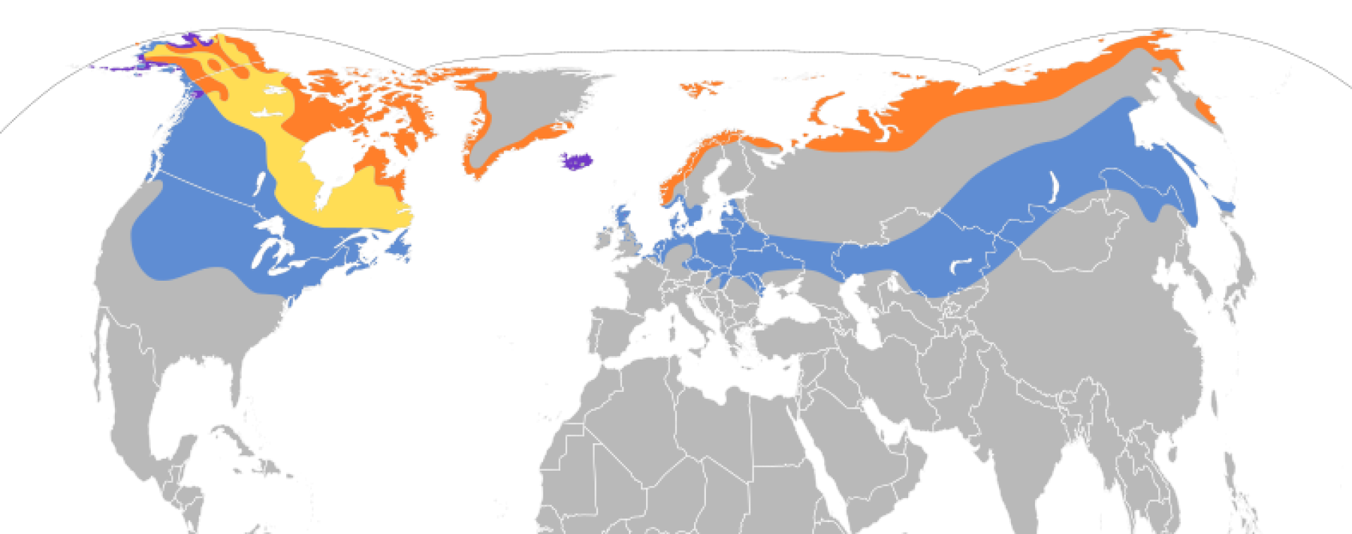 térképen narancsszínnel van jelölve a hósármány költőterülete, kék színnel a telelőterülete.