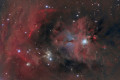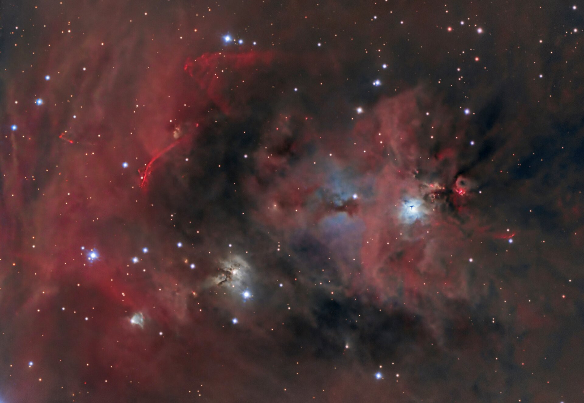 Az NGC 1999 formákban izgalmas területe, középen a kékes reflexiós köddel, benne egy rejtélyes fekete üreggel