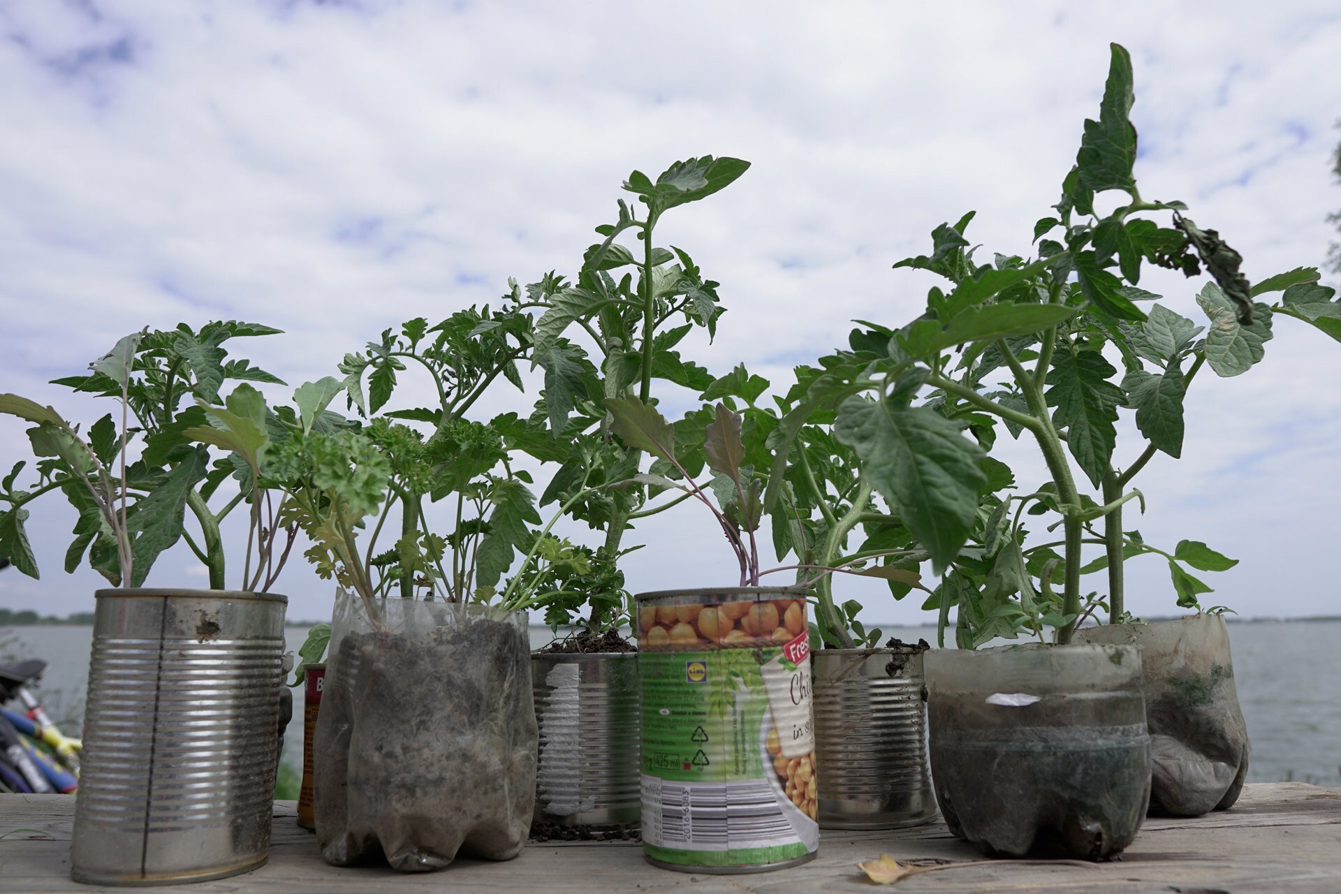 Már szép nagyok a palánták. A fenntarthatóság jegyében a magok a szigeten összeszedett szemétből lett kaspókba és vakondtúrásokból származó földbe lettek ültetve