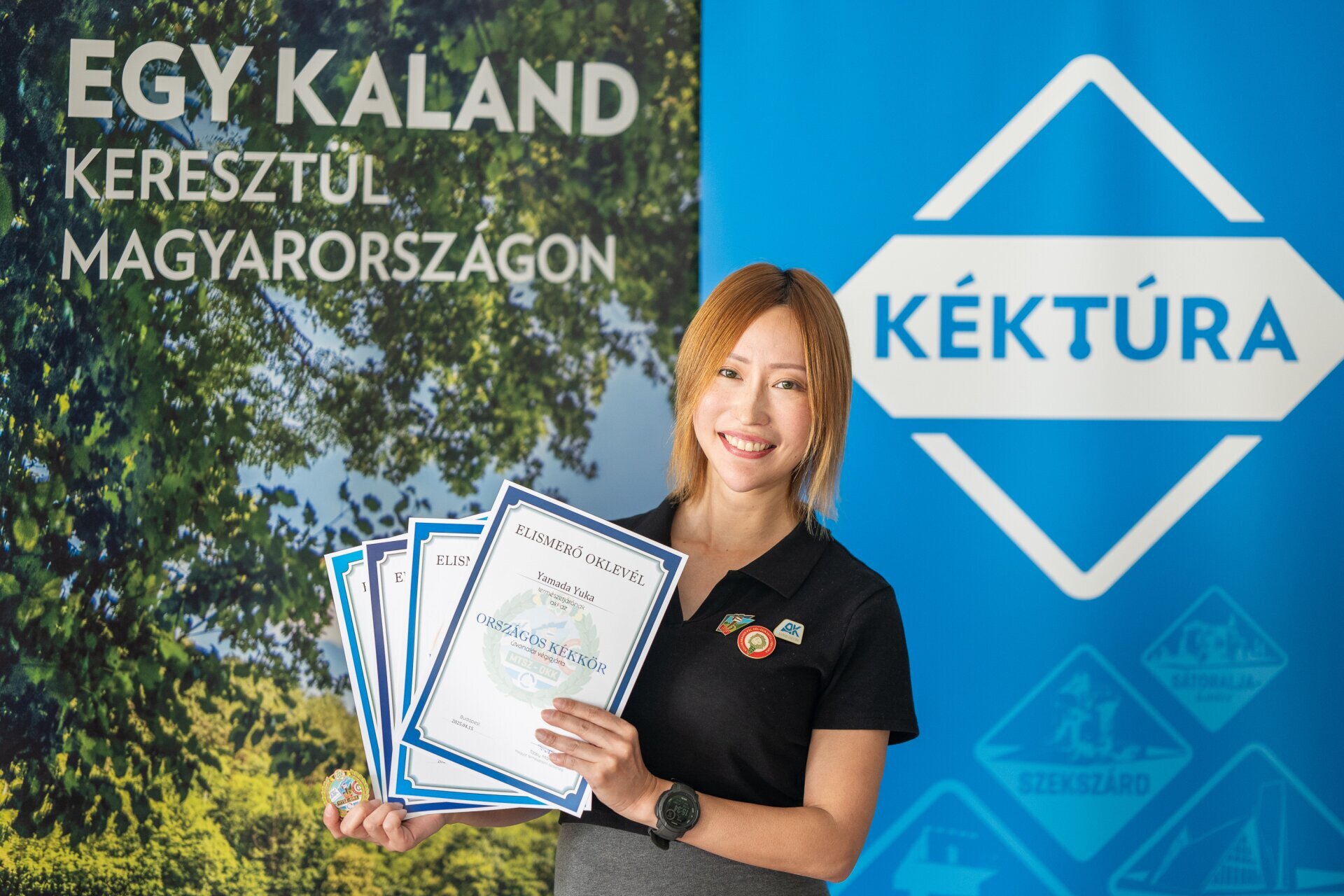 Yamada Yuka a Magyar Természetjáró Szövetség irodájában vette át az okleveleket és a jelvényeket