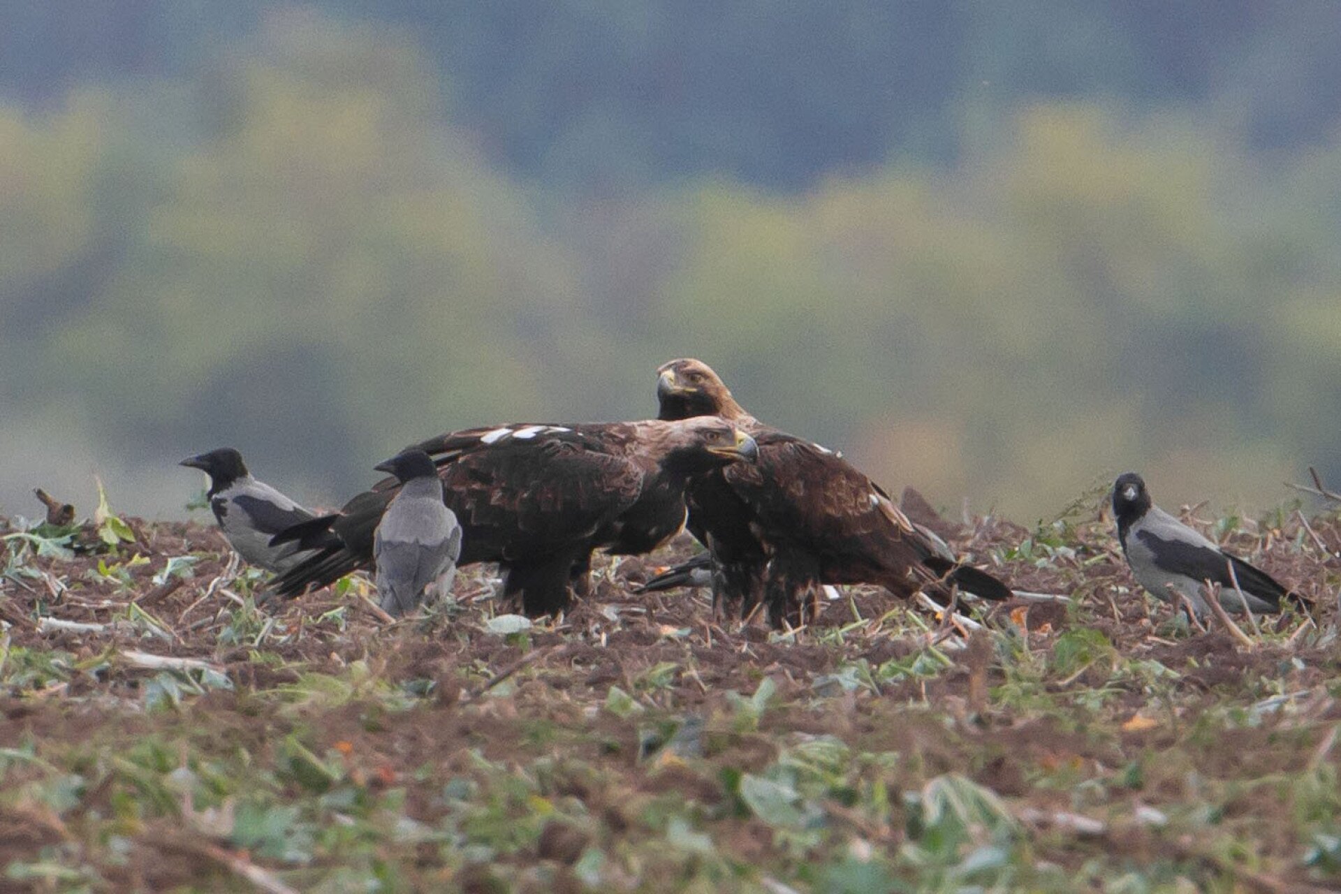 Öreg parlagisas-pár dolmányos varjakkal. A bal oldali tojó megdagadt begye arról árulkodik, hogy sikeresen zsákmányoltak