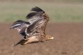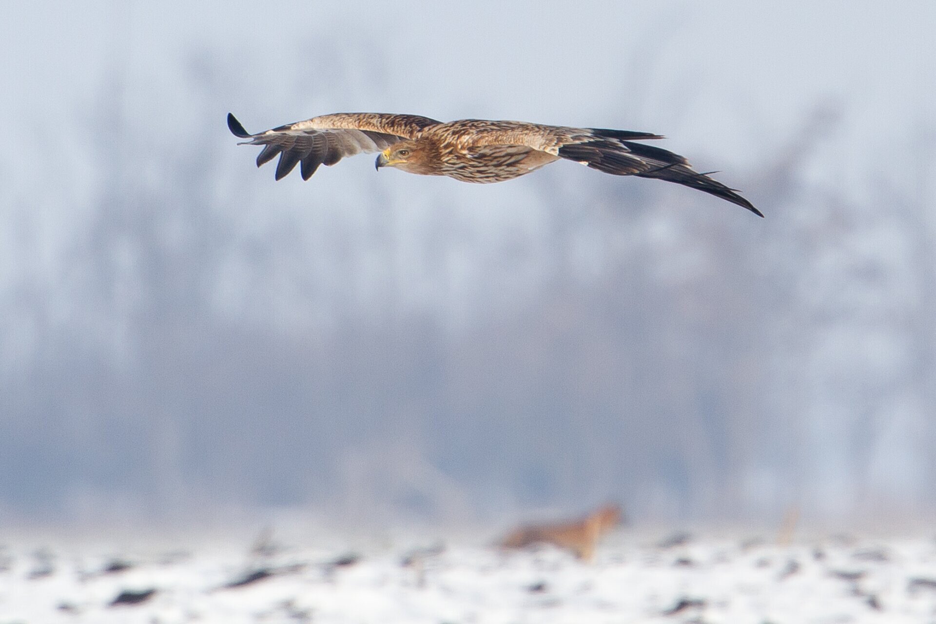 Első teles parlagi sas a hófödte jászsági táj felett. Hazánkban az egyik legnagyobb parlagisas-állomány a Jászság területén található, az itt fészkelő párok száma eléri a negyvenet