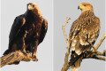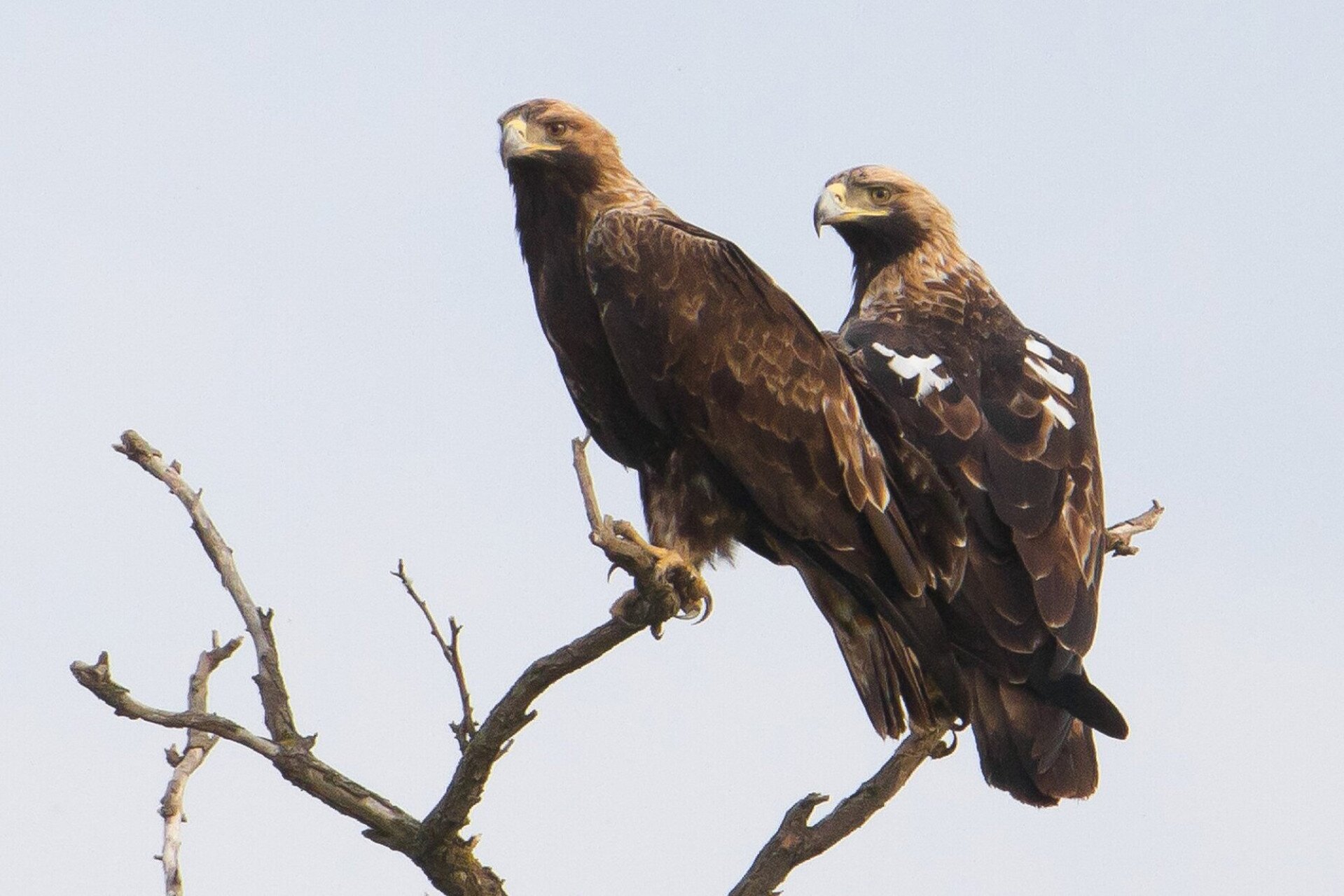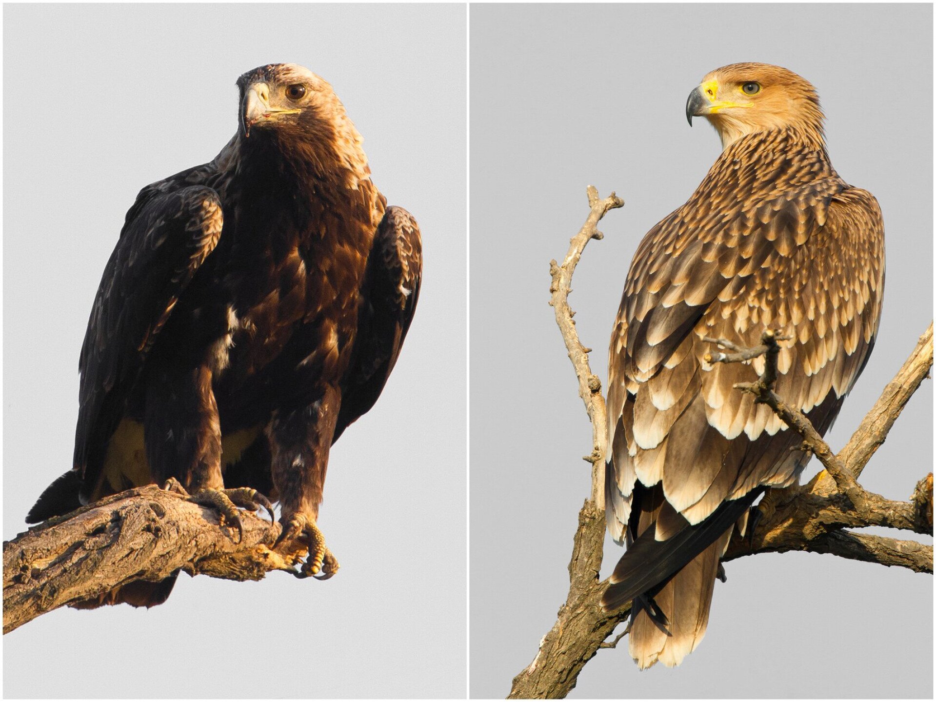 Bal oldalon öreg tollruhás sötétbarna, majdnem fekete madár megszokott őrfáján pihenve. Jobb oldalon fiatal, új tollruhás frissen kirepült madár. Világos homokszínű tollazata alapján gyorsan azonosítható