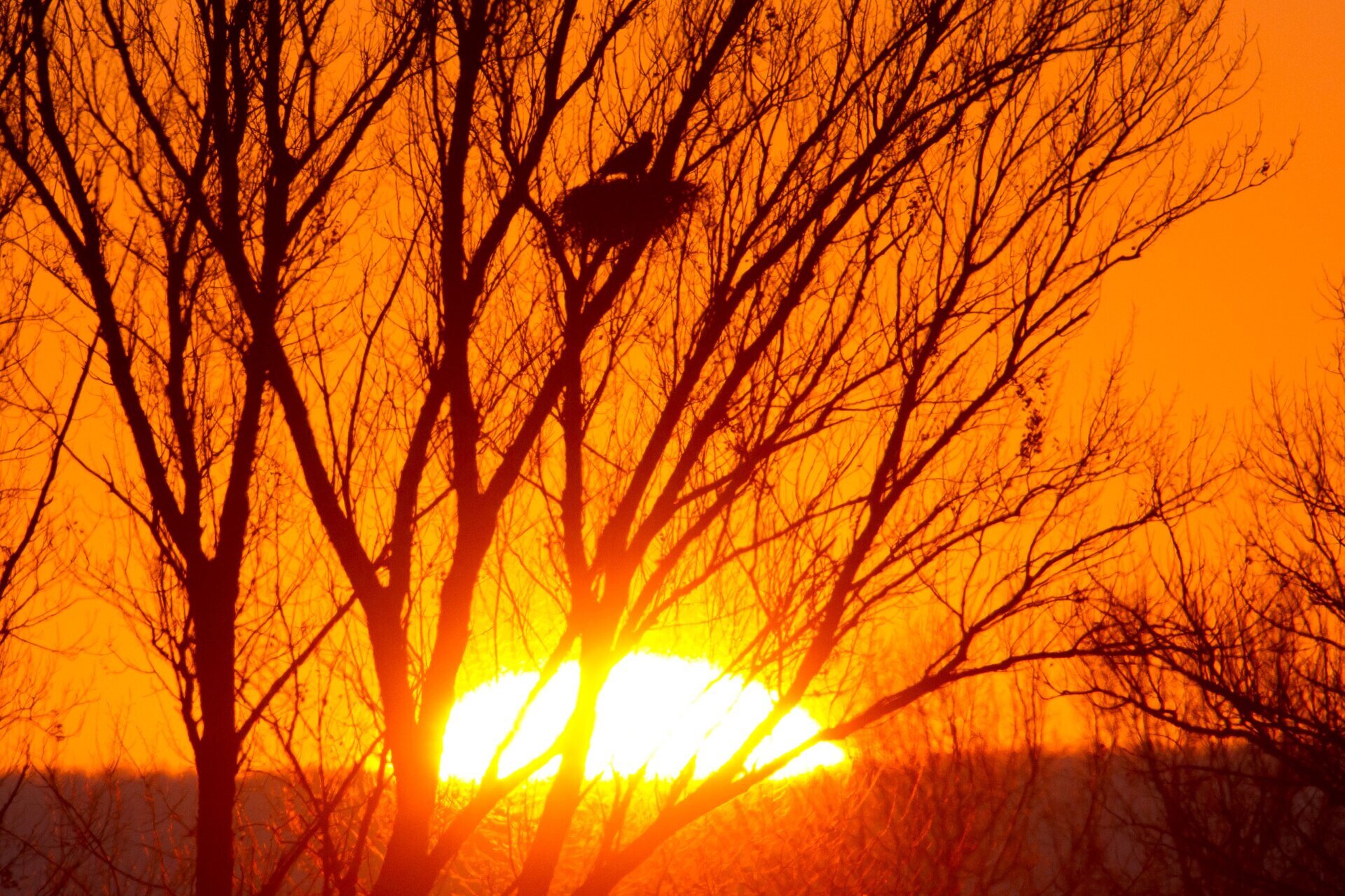 Méretes fészkét és egyben territóriumát őrző öreg parlagi sas a januári naplemente fényeivel