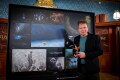 Potyó Imre A magyar természetfotó nagydíja első helyezettje képei előtt. Idén az első három helyezett külön paravánt kapott a kiállításon