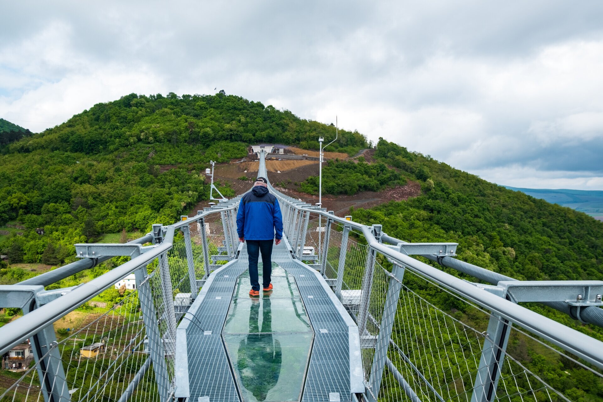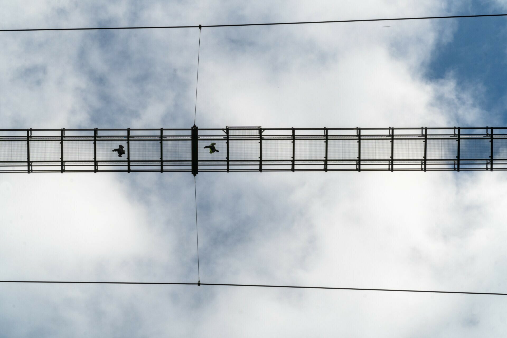 A két oldalsó drótkötél akadályozza meg, hogy a szél belengesse a hidat