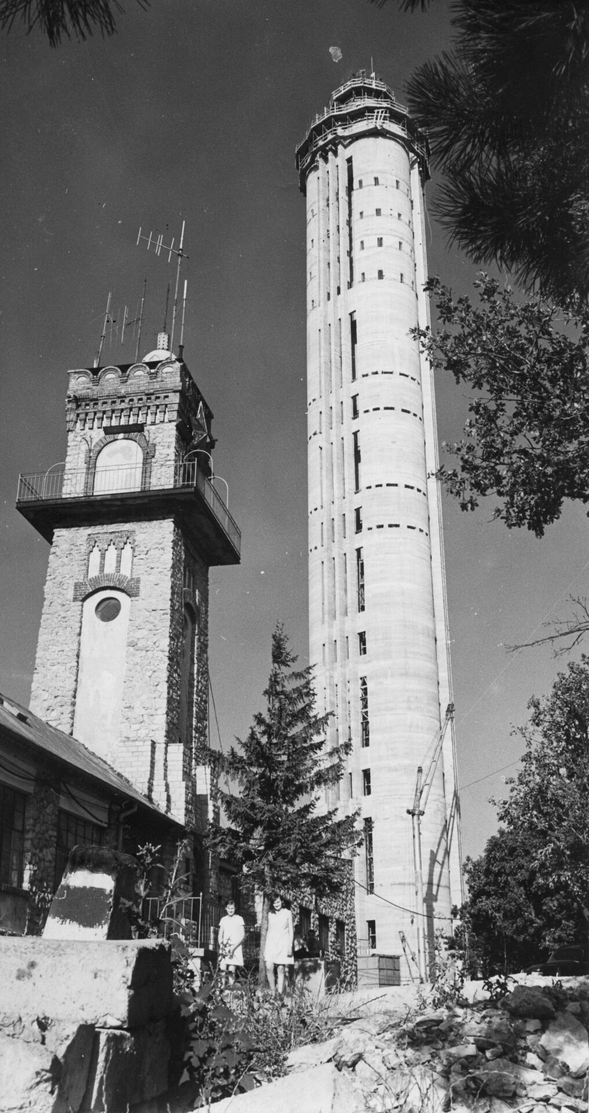 A Mecsek Egyesület Kiss József-kilátója és az épülő tévétorony a Misinán 1968-ban
