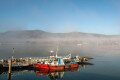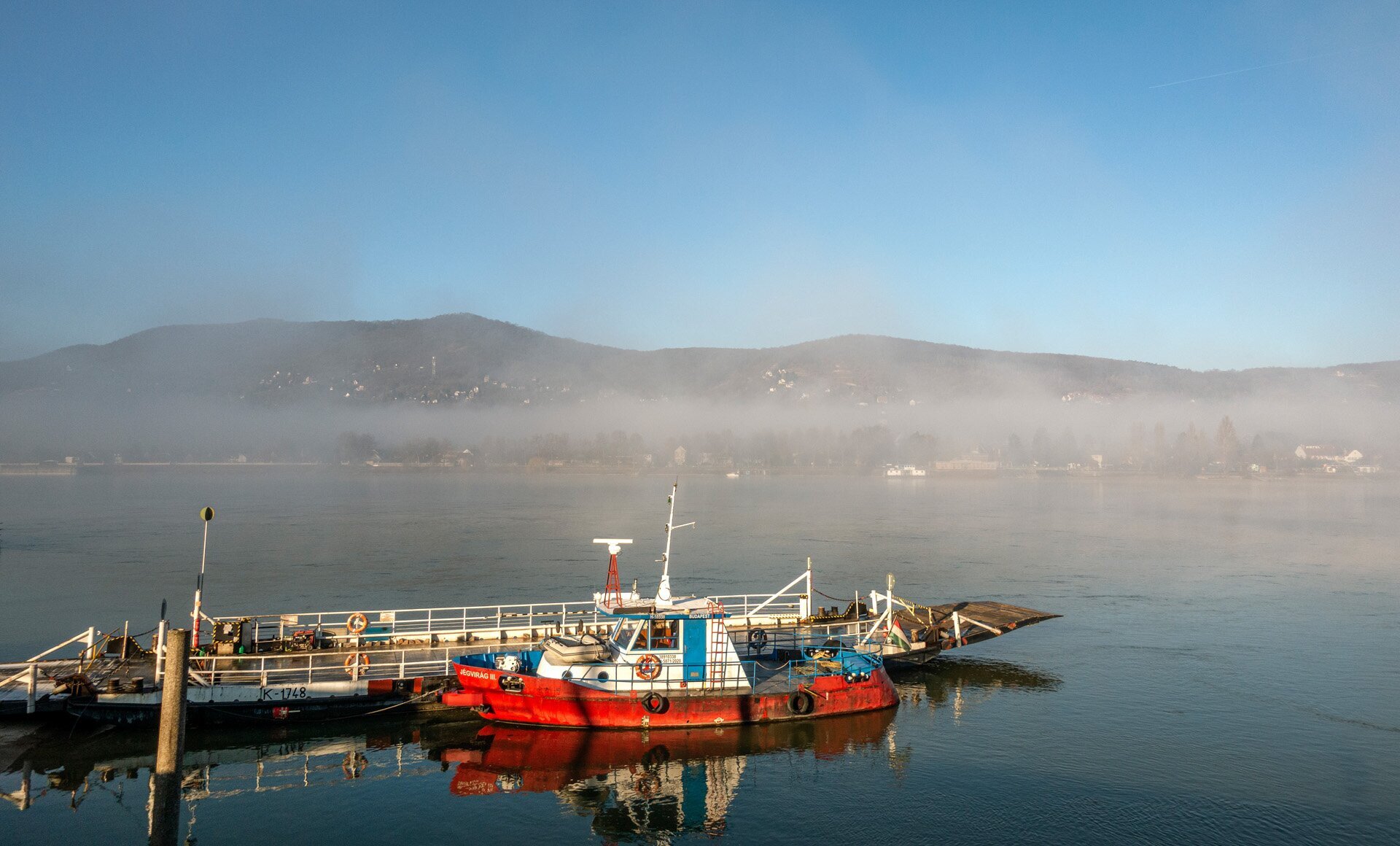 Kicsit olyan, mintha egy norvég fjordban kifutásra várna egy kis halászhajó. De ez itt a visegrádi Duna-part, ahol a rév megszokott tolóhajója helyett most ez a helyes kis piros dolgozik
