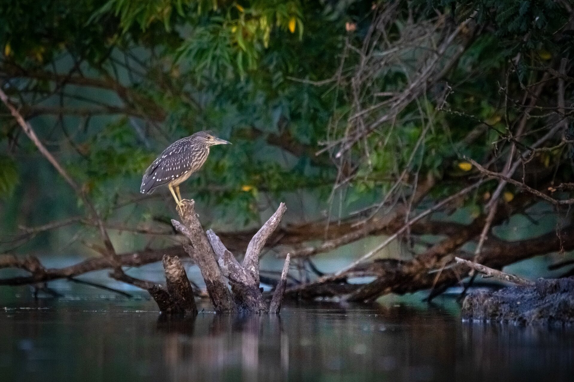Barna rétihéja a Tisza-tó leapadt nyári vizéből kibukkant fatuskón
