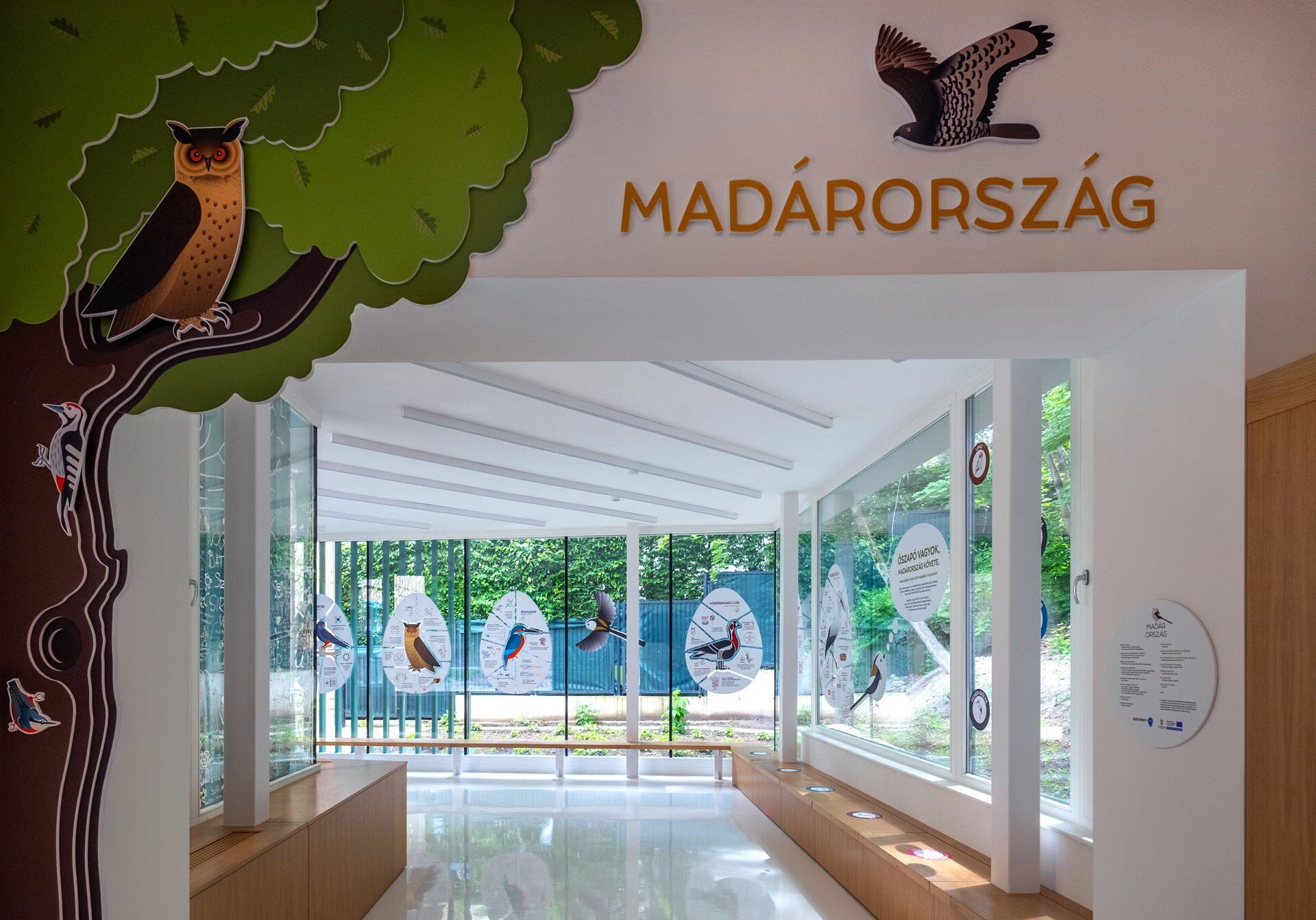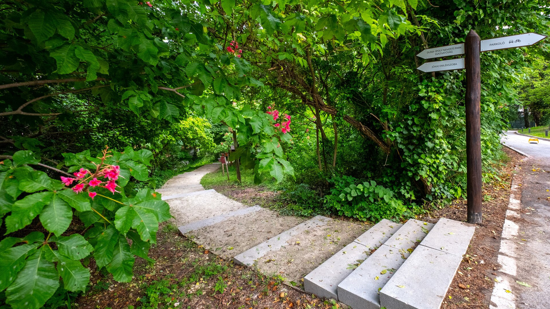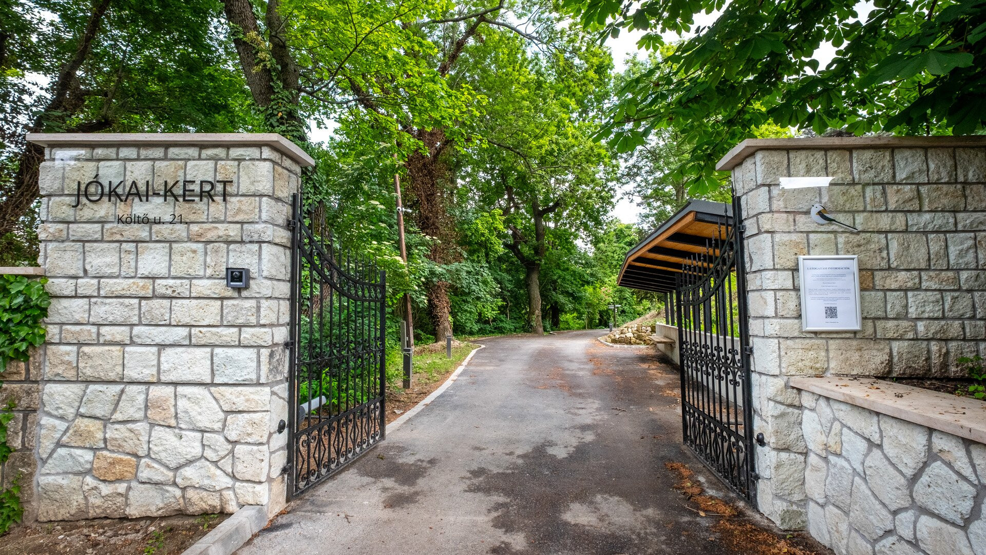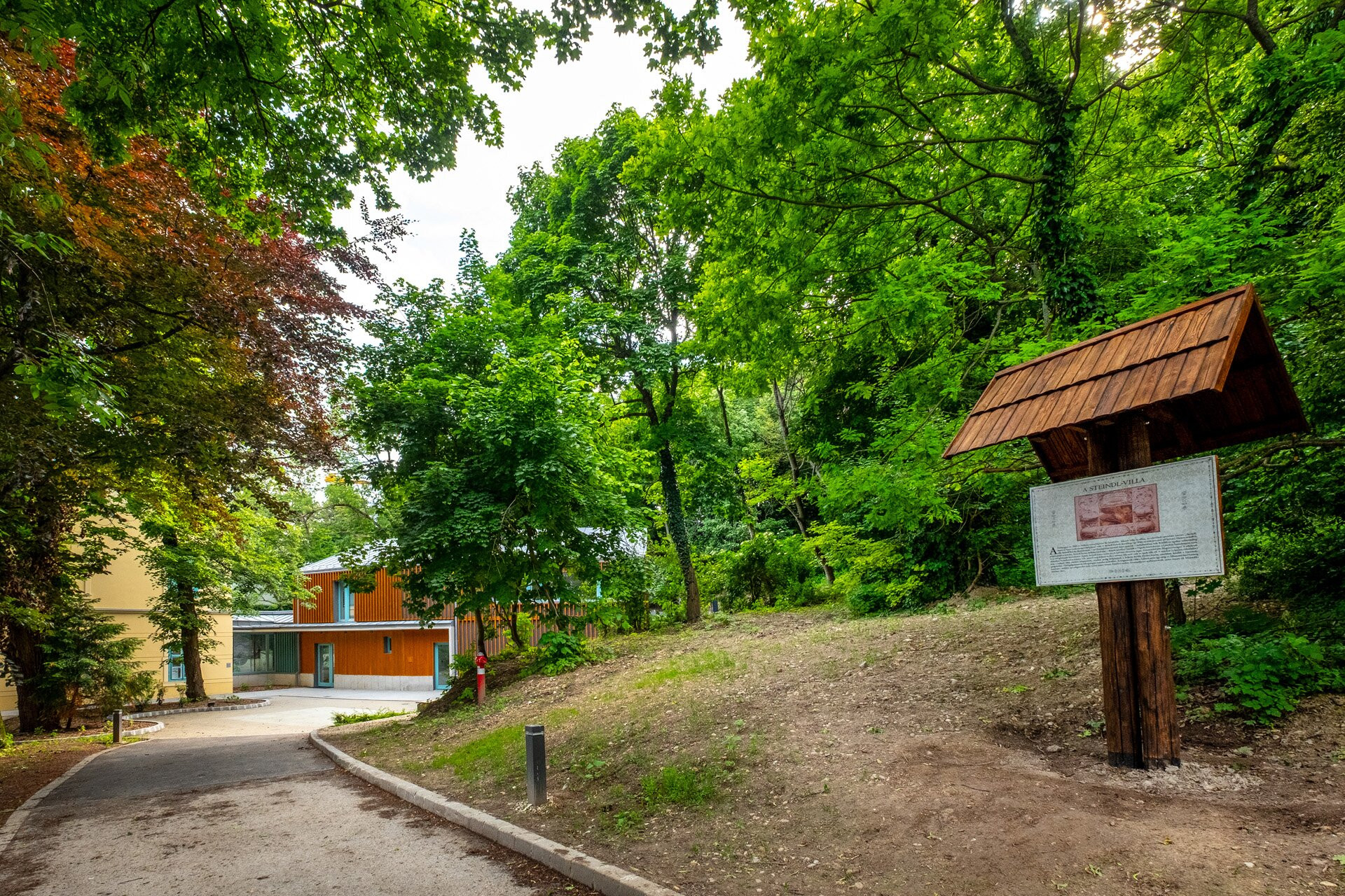 Balra a felújított Steindl-villa, jobbra az új látogatóközpont épülete