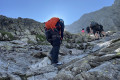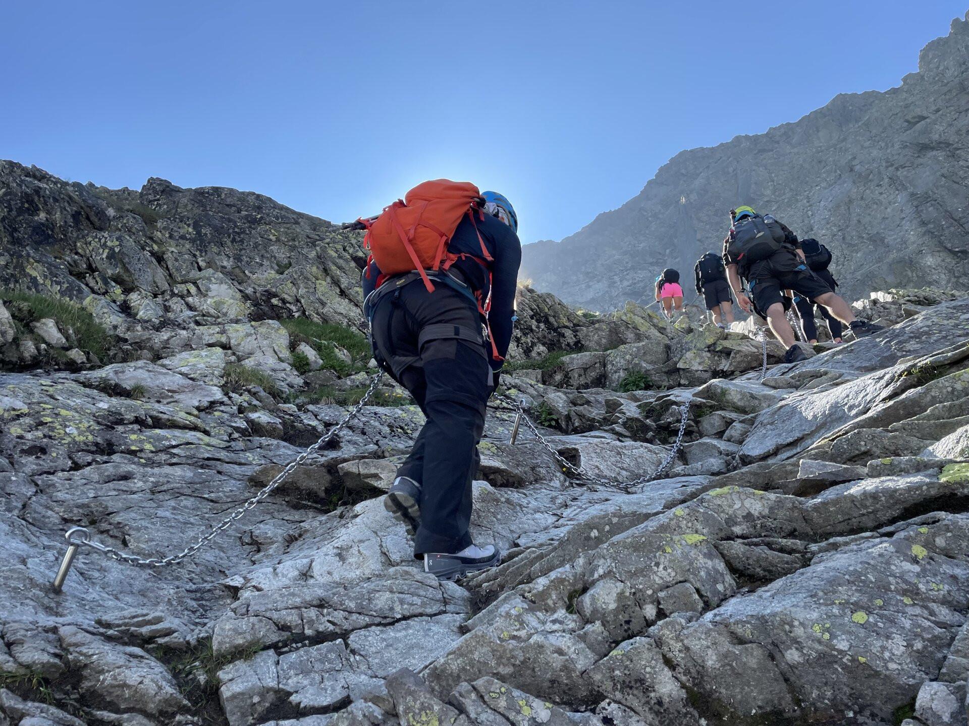 A csúcshoz közeledve láncok is segítik a kapaszkodást, de igazából ezek nélkül is el lehet boldogulni a jó fogást adó sziklákon