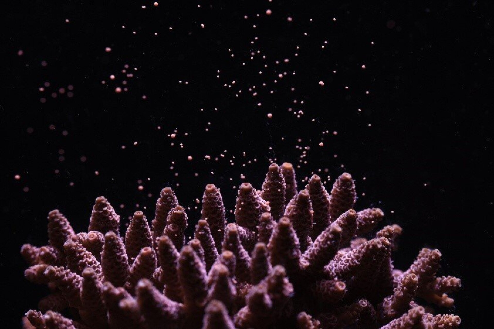 Acropora muricata ex situ ívás. Az éves ívási események során néhány perc alatt több ezer petesejt/spermacsomag kerül a vízbe