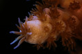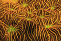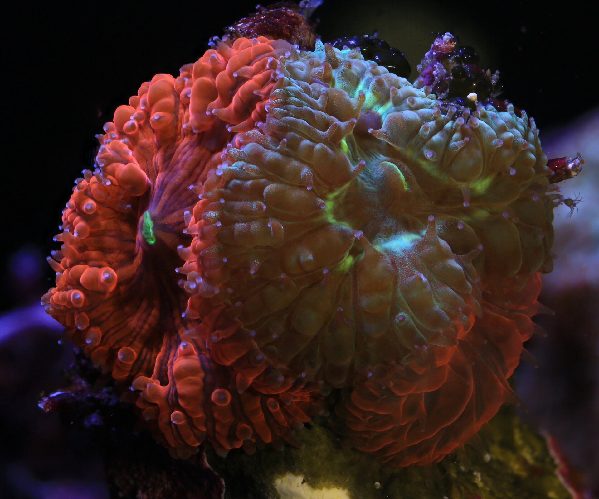 Fluoreszkáló töklámpás, Leptoseris mycetoseriodes korallzátony, 20 000 kelvines megvilágításban, sárga szűrővel fényképezve