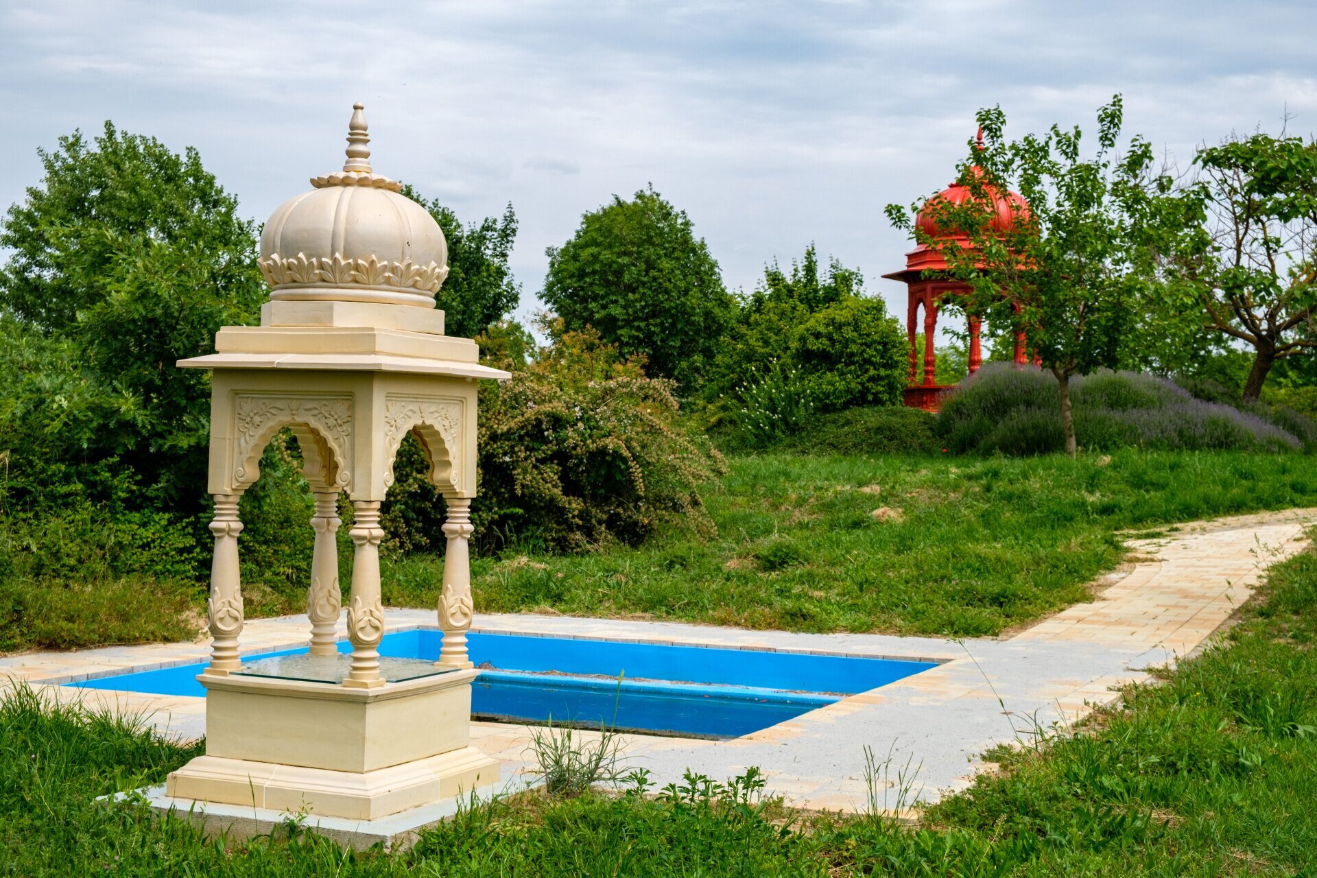 A dísztó partján egy indiai stílusú pavilon áll. Tökéletes helyszín az elmélkedéshez.