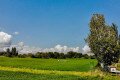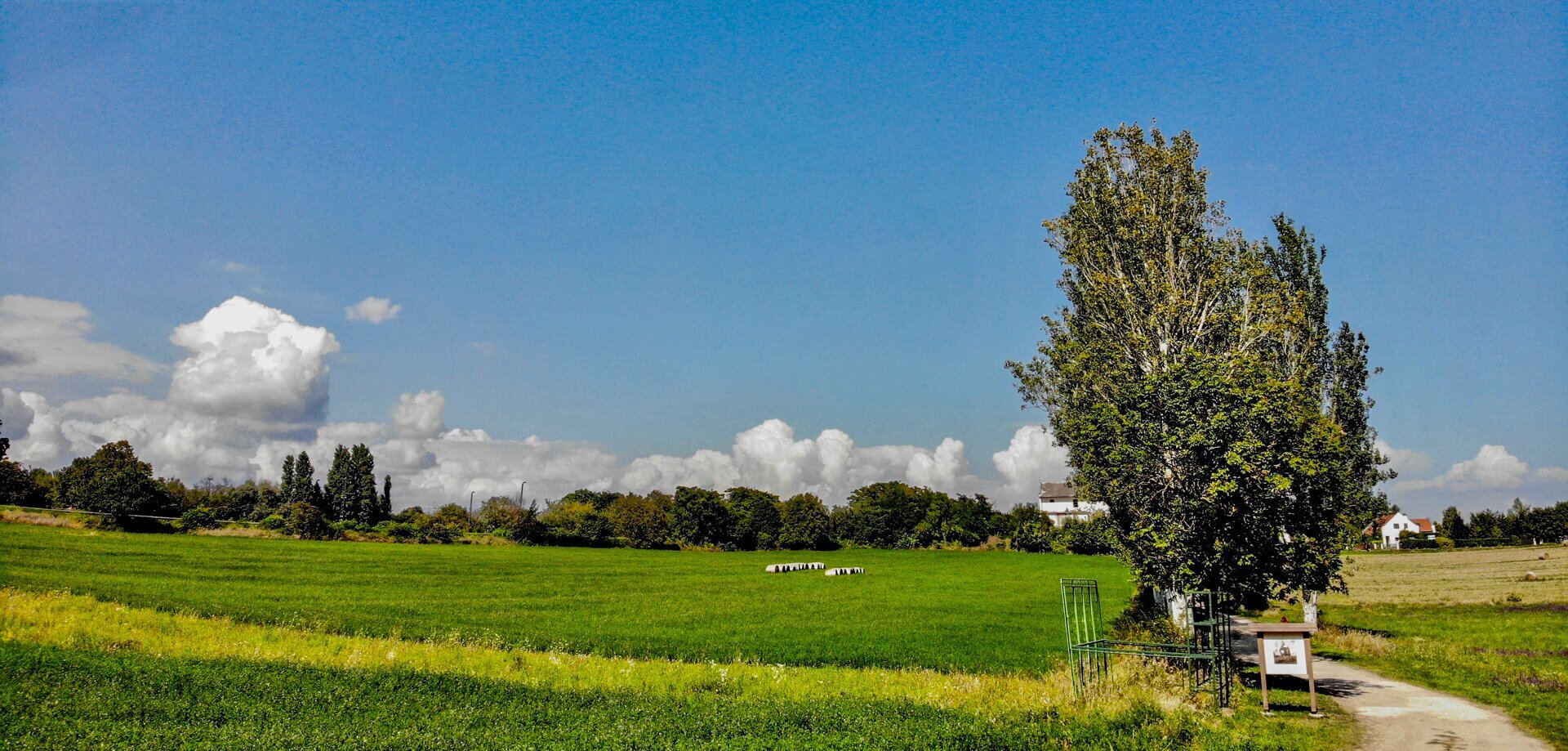 A templomromhoz vezető fákkal szegélyezett út és a környező szántóföldek