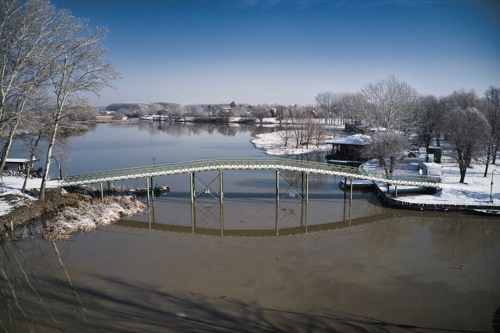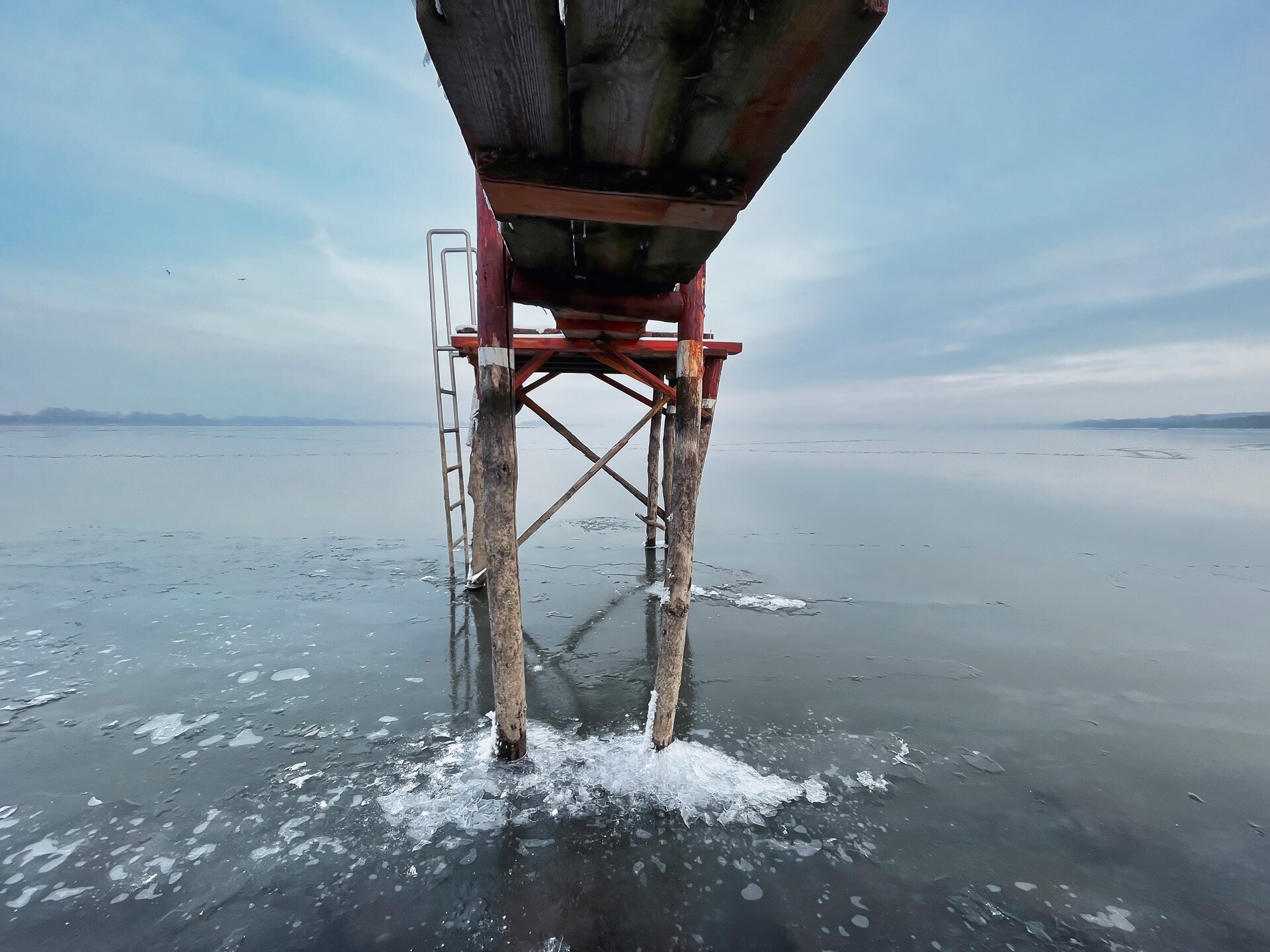 „Ez a második tele a JóreményStégnek. Büszke vagyok rá, hogy ilyen jól bírja. Itt a téli vízszintet láthatjátok. Nyáron a fehér csíkig ér a Tisza. pont azért festettem a cölöpre, hogy lássam télen a különbséget. Bő másfél méter. Jobbra a távolban Abádszalók lenne látható, ha látható lenne, de ez egy hatalmas tenger ilyenkor, nem látni a másik végét”