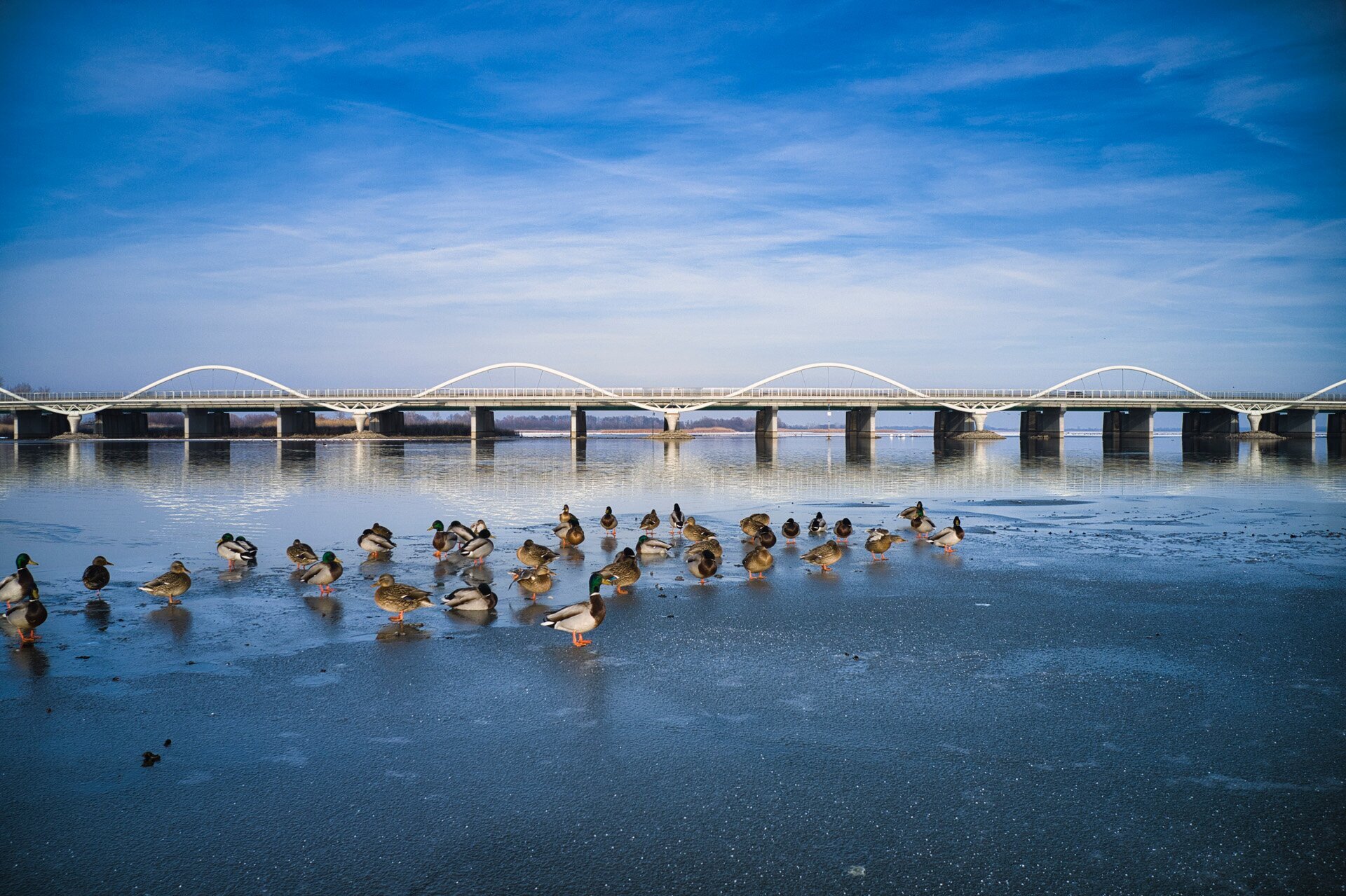 „Tőkés récék napoznak a híd előtti fagyos iszap-szigeten.”