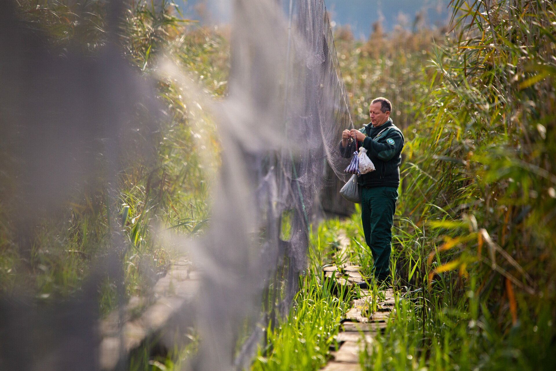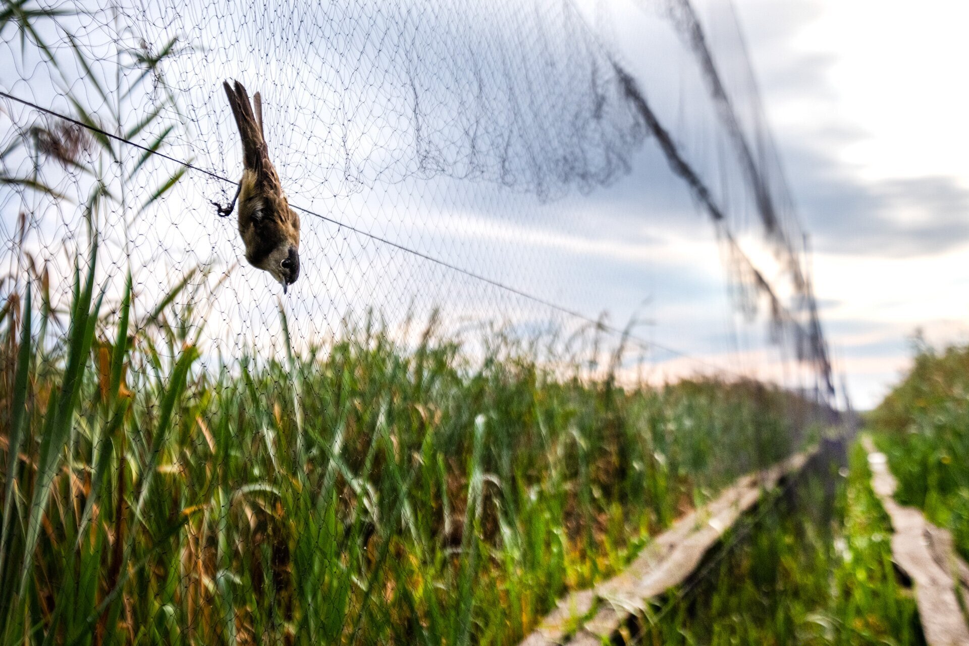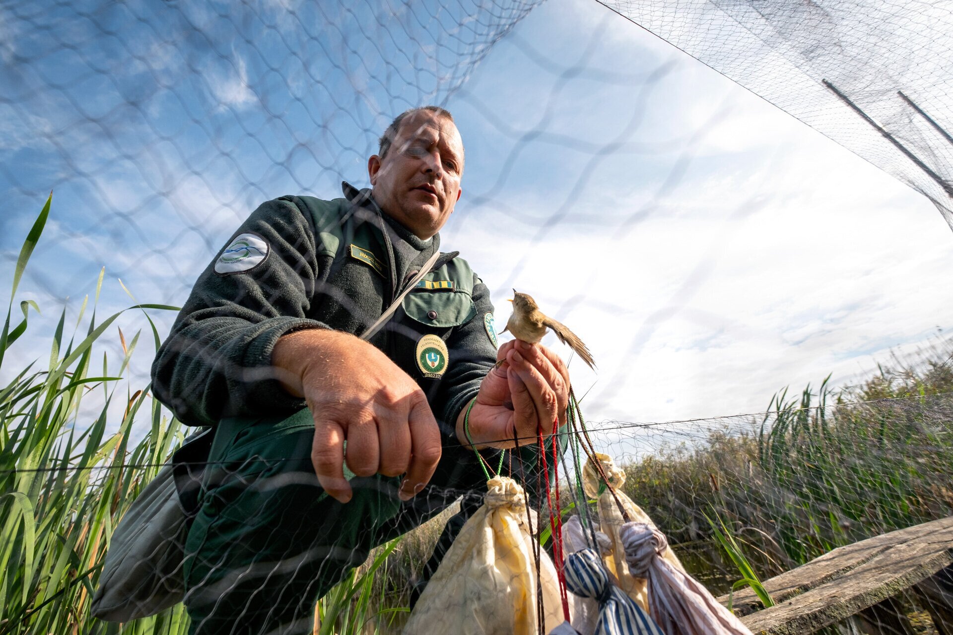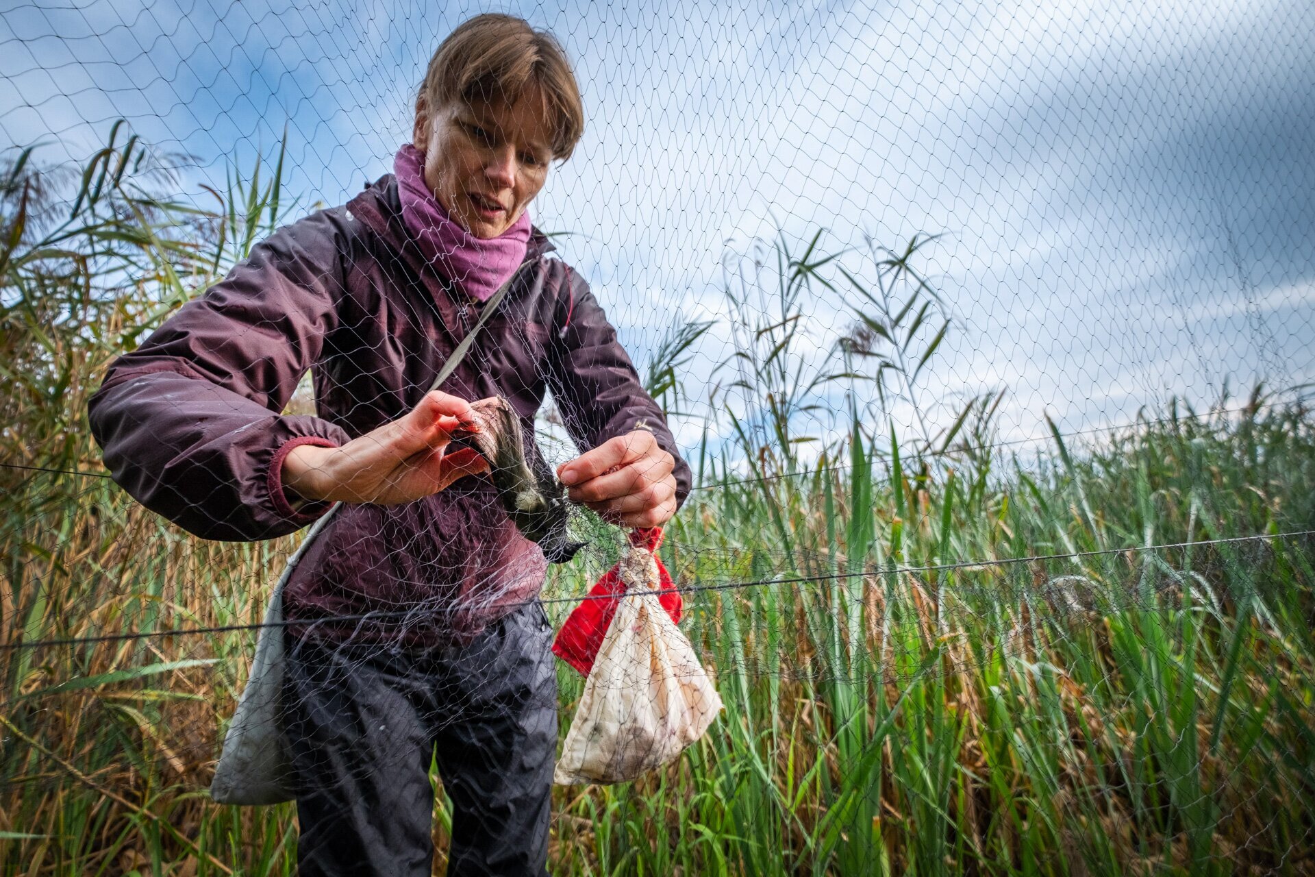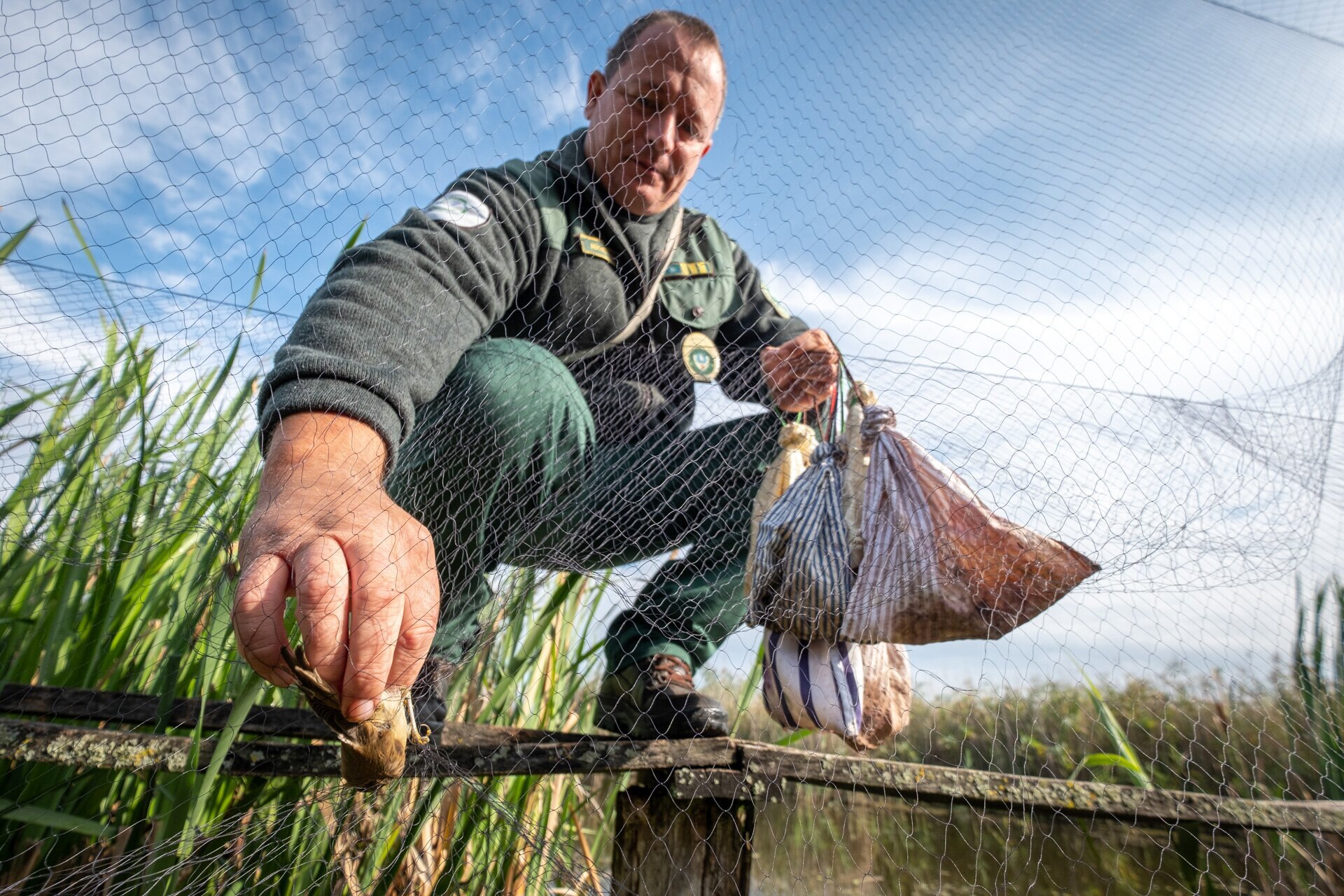 A gyűrűzők a hálóállásokat óránként végignézik, és kiszedik a hálókba repült madarakat